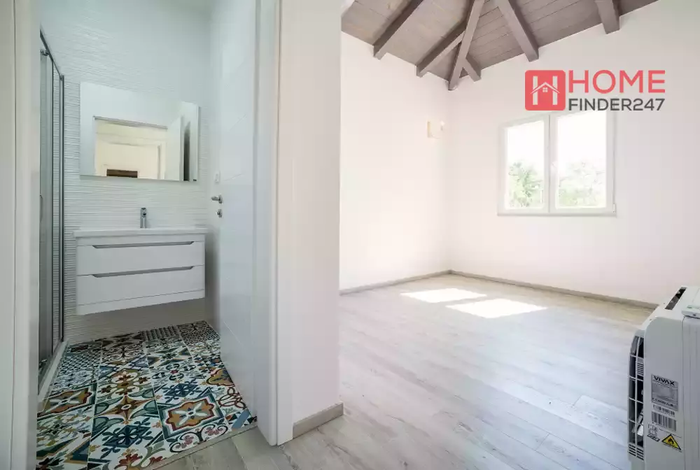 Im ersten Stock befinden sich zwei Schlafzimmer mit Badezimmern und privaten Balkonen. Vom Wohnzimmer aus haben Sie direkten Zugang zur schönen Terrasse, die auf den Garten mit Pool und die grünen Hügelblicke blickt.