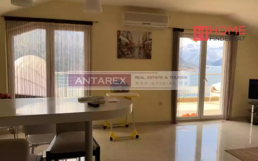 Helles, sonniges Appartement in Dobrota, Kotor, mit traumhaftem Blick auf die Boka Bucht und die umliegenden Berge. Das Apartment befindet sich im Dachgeschoss und nimmt die gesamte Etage ein – keine Nachbarn! Die Fläche beträgt 112 m², inklusive 24 m² Sonnen-Terrasse.