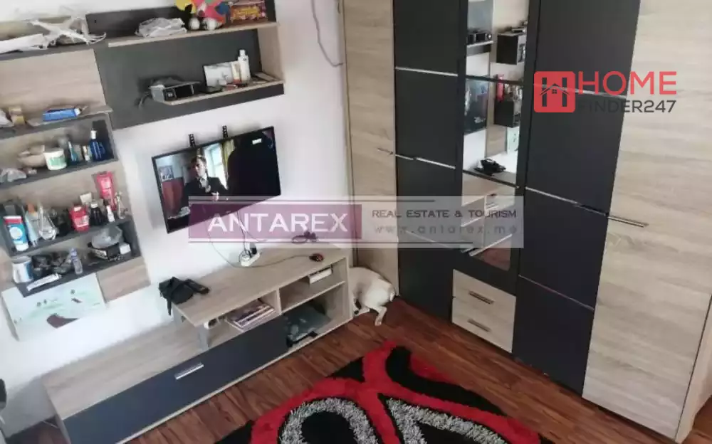 Der Grundriss des Hauptaparts umfasst einen Flur, ein Wohnzimmer mit Küchenbereich, ein Schlafzimmer und ein Badezimmer. Das Gästeapartment besteht aus einem Wohnzimmer mit Kochbereich und einem Badezimmer.