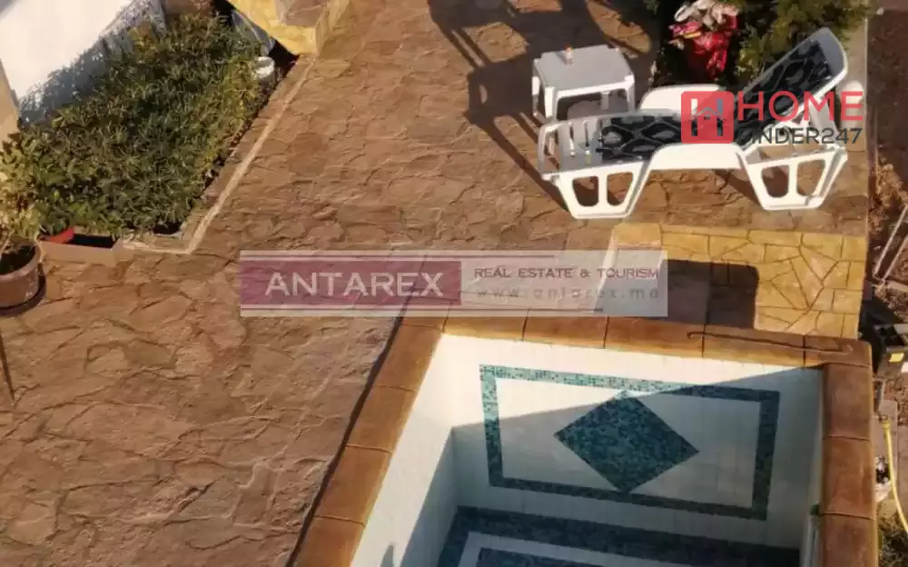 Das Haus ist neu gebaut, mit flachem Dach, das die Möglichkeit für einen zusätzlichen Stock bietet. Das Fundament ist hoch mit natürlichem Naturstein verkleidet.