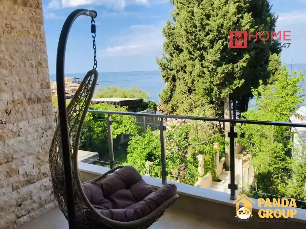 Die Villa wurde 2018 erbaut und bietet direkten Zugang zum eigenen Kiesel- und Sandstrand. Der Weg zum Meer ist Teil des Grundstücks, umgeben von grünen Pflanzen.