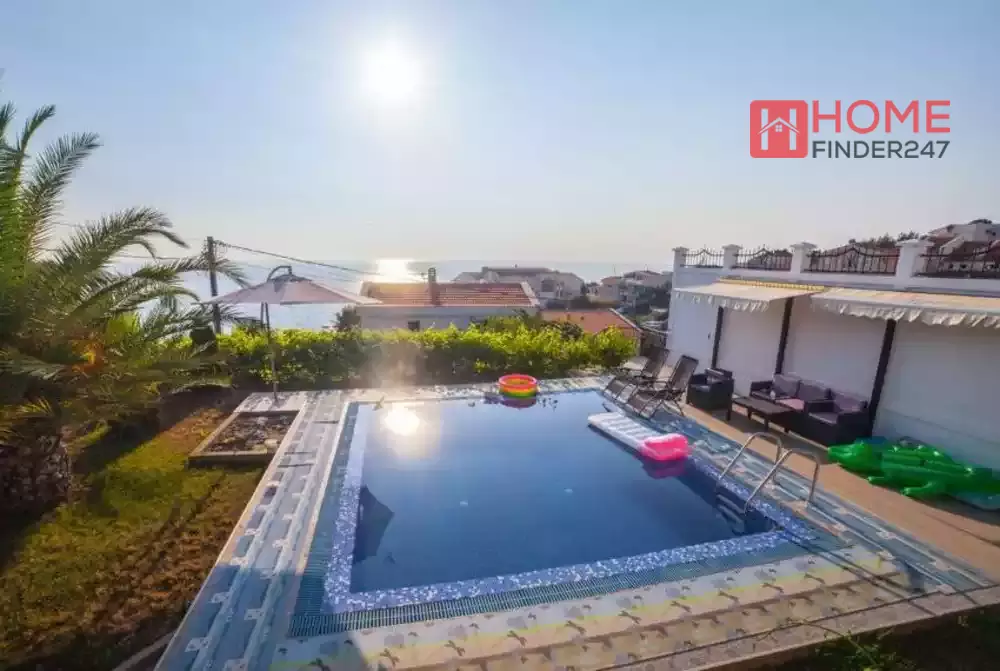 Es verfügt über vier Schlafzimmer, eine separate Gästewohnung, Sauna, Swimmingpool und einen liebevoll gestalteten Garten mit Mandarinen, Granatäpfeln, Trauben und Kiwi.