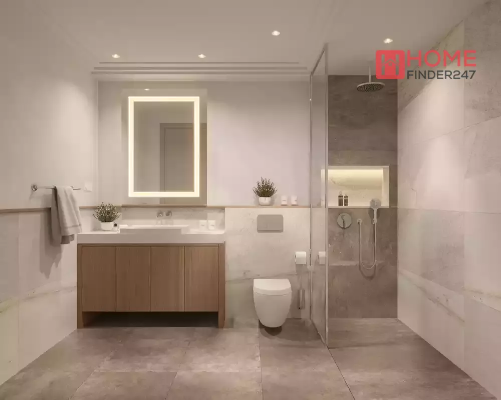 Hochwertige Hansgrohe-Armaturen in den Bädern garantieren Komfort. Die Beleuchtung ist bis ins Detail geplant, um eine angenehme und ästhetische Stimmung zu schaffen.