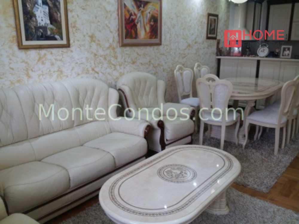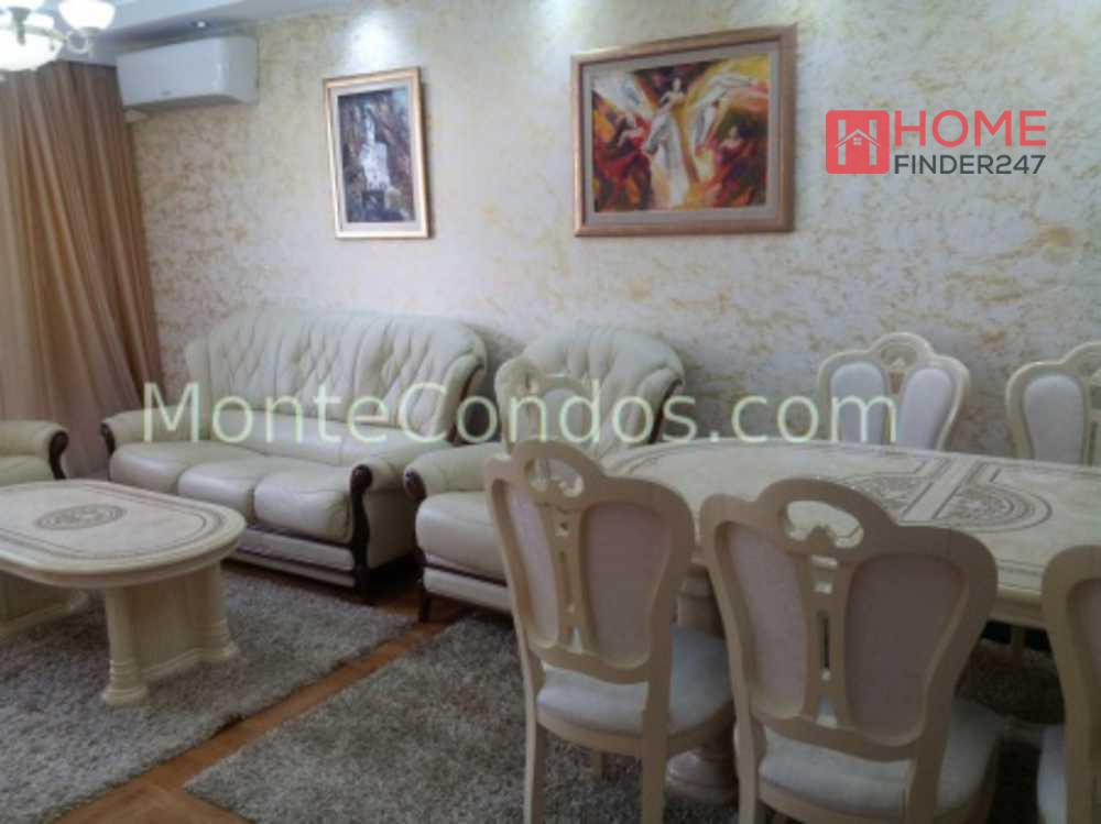 in the living room - a sofa with armchairs, a TV cabinet, a dining table with chairs, air conditioning,