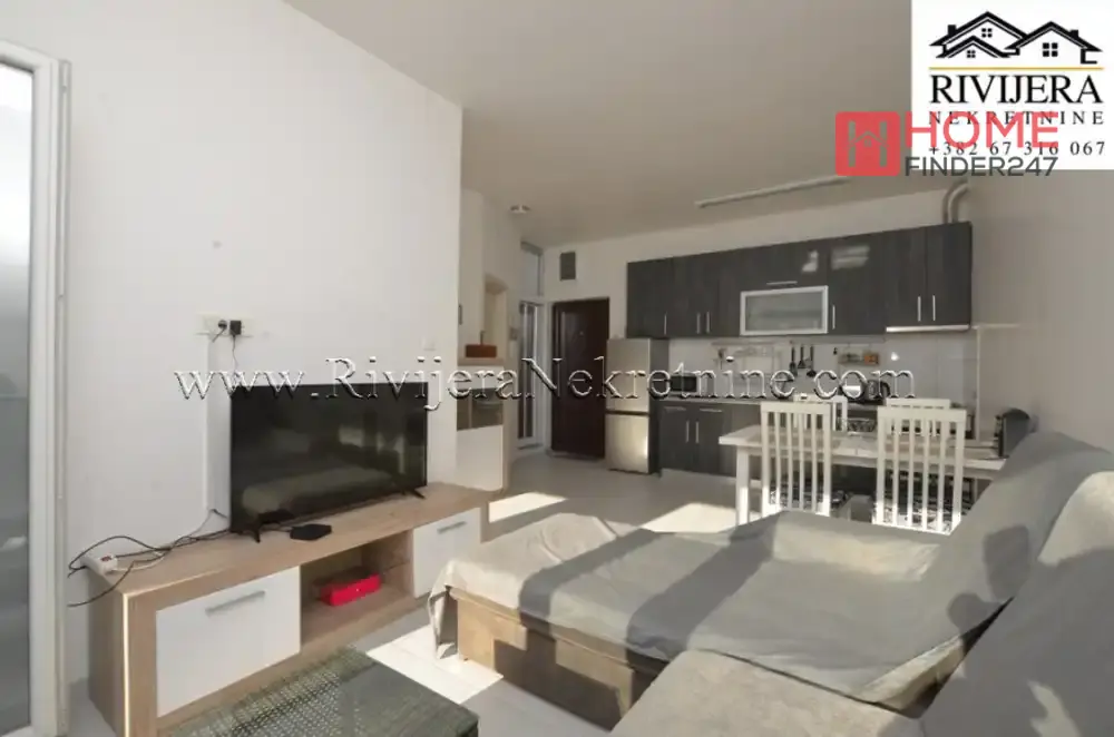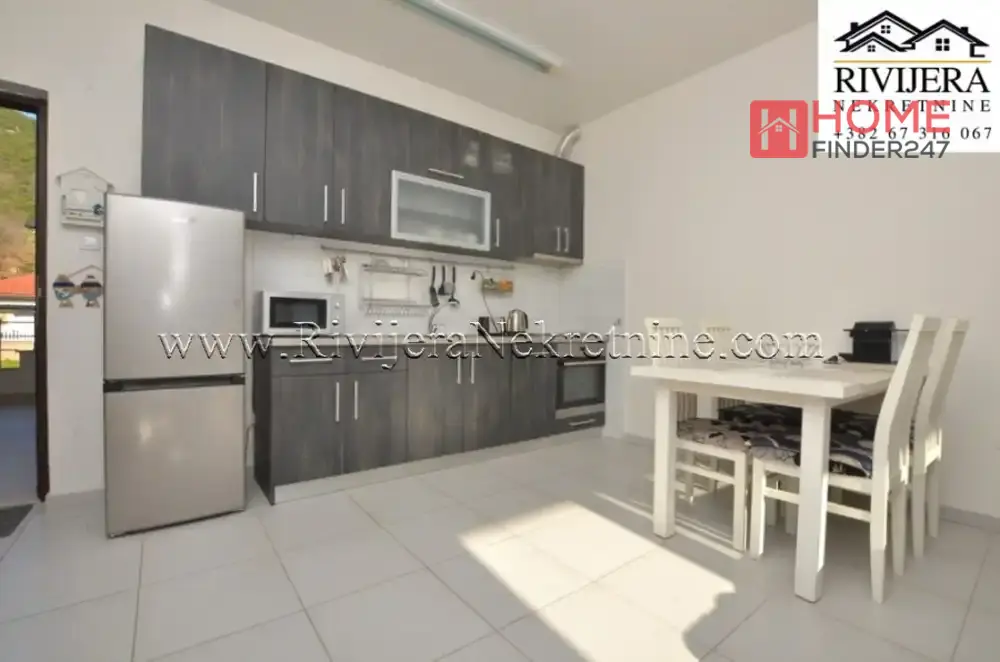 Layout: living room, dining room with kitchen, bedroom, terrace, and bathroom. Apartment in a smaller residential building, 200m from the sea, 15km from Tivat airport. Price: €132,000