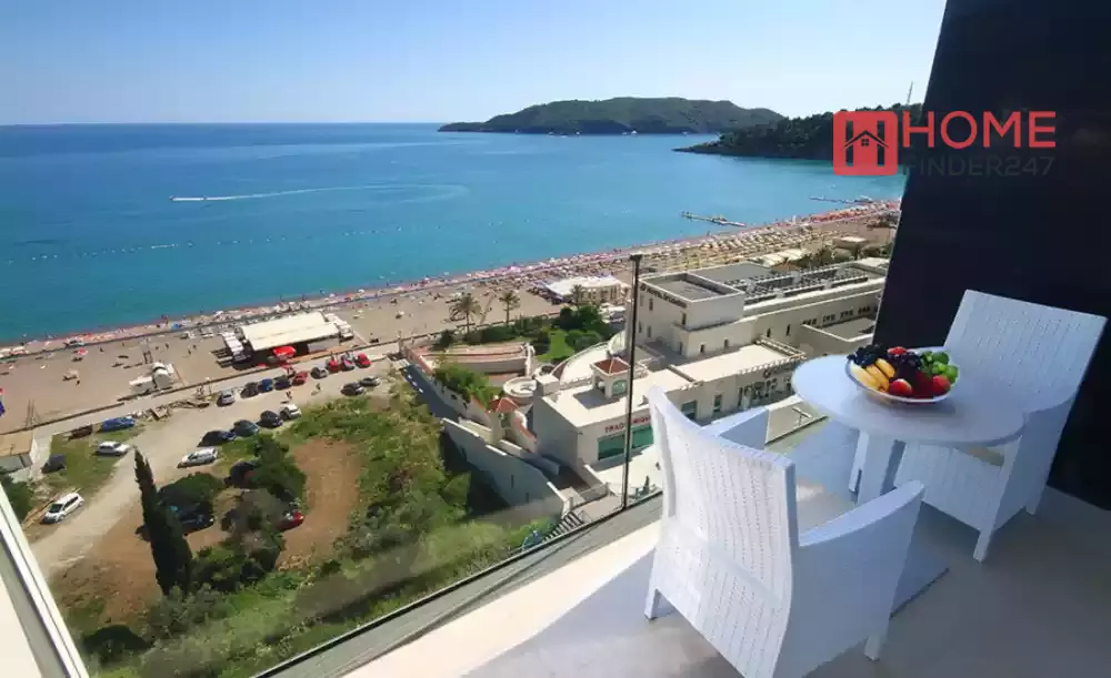 The apartment has a fully equipped kitchen with all amenities (flat plate, oven, dishwasher, refrigerator), dining area, bar and bar stools, living room luxuriously equipped with expensive leather furniture that can be converted into a bed for two, bedroom and terrace with a glass fence with an incredible, completely open view of the beautiful Becici beach and the sea.