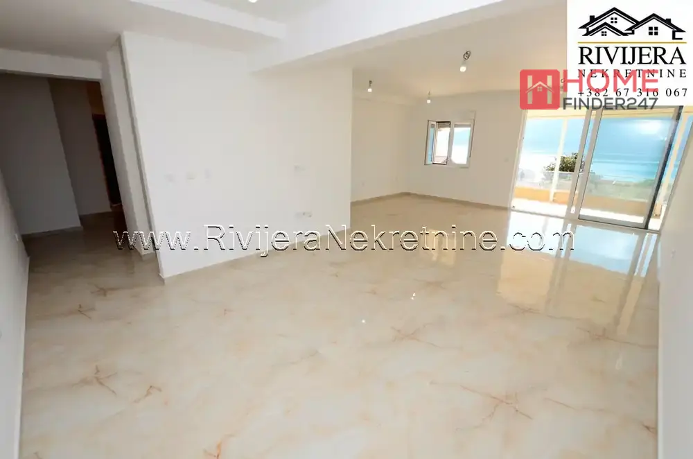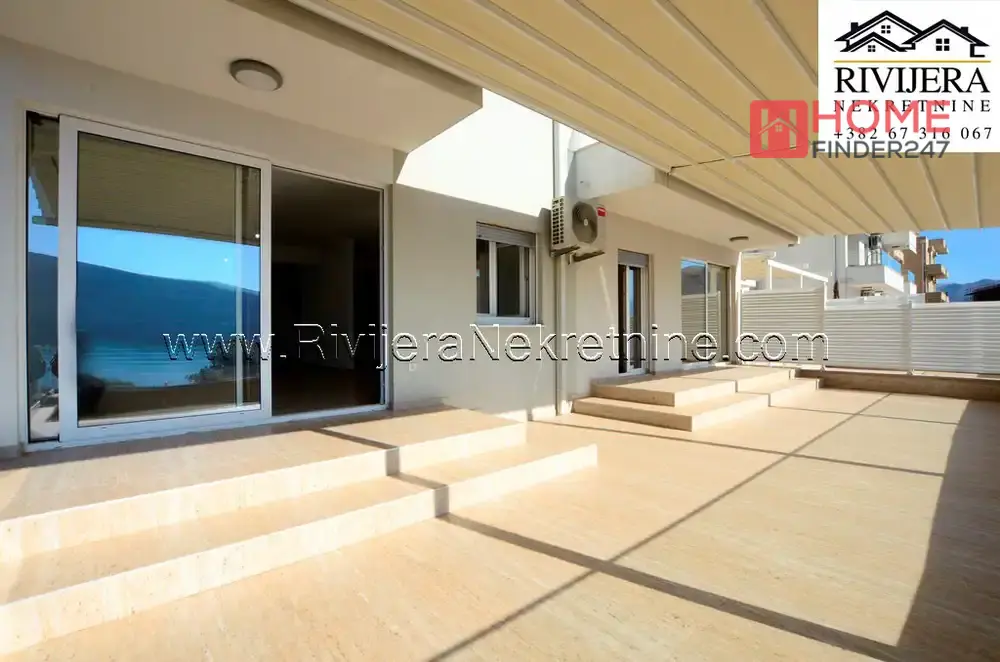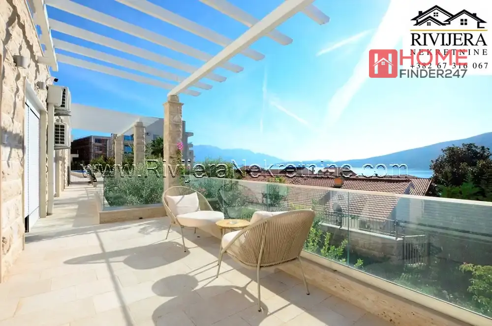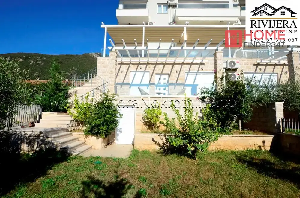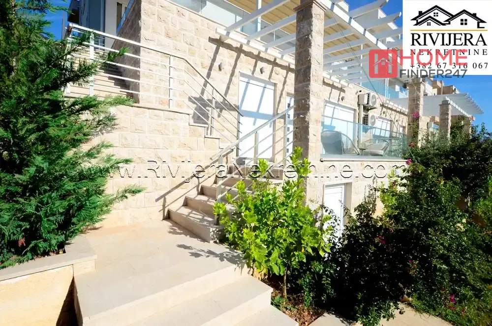 A new exclusive apartment with a yard overlooking the sea Djenovic. High-quality construction, built-in materials, south-facing, sunny apartment. Attractive location near the sea, 1 km from Portonovo. The total area of the apartment (with covered terraces) is 157 m2 consisting of two bedrooms, two bathrooms, a kitchen, a living room, large south terrace facing the sea. Below the apartment are two furnished one-room apartments of 58 m2 each (with terraces, south-facing, sunny), a storage room of 15 m2, a fenced, cultivated yard of 233 m2, and an underground garage (elevator from the garage to the apartment). Price on request
