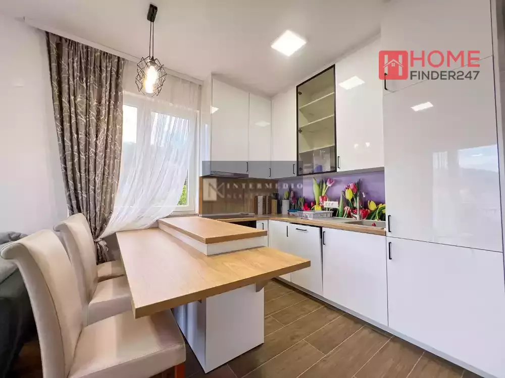 Structure of the apartment: Entrance hall with a built-in wardrobe in which there is a washing machine, boiler and additional storage space, bedroom, bathroom, living room with kitchen and dining room.