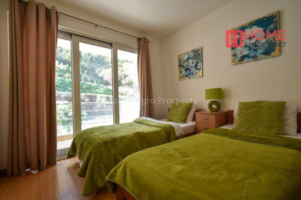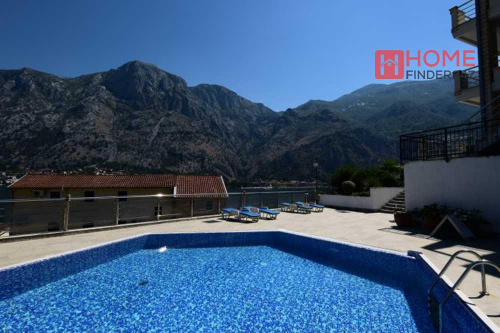 This spacious and bright two bedroom apartment with stunning views over the sea and the Old town of Kotor is located in Muo. It is part of a small residential complex with pool and spacious sunbathing area. There are two buildings in total and each building consists of 9 apartments.