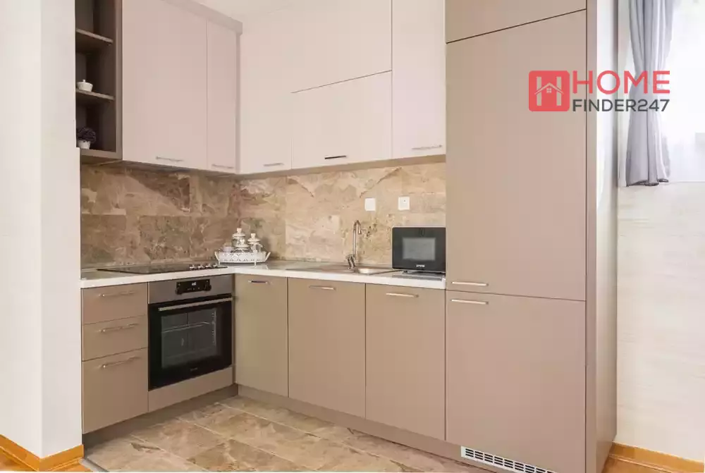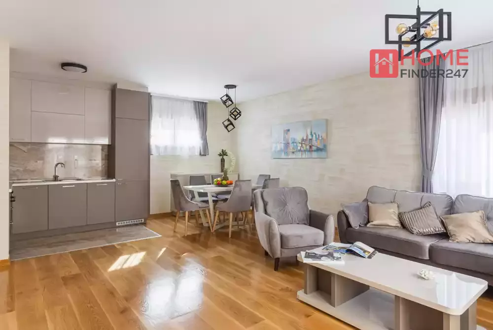 One-bedroom apartment of 68 m2 provides very compact and comfortable layout. It has an open concept living room with the kitchen and dining room, one bedroom and a bathroom.