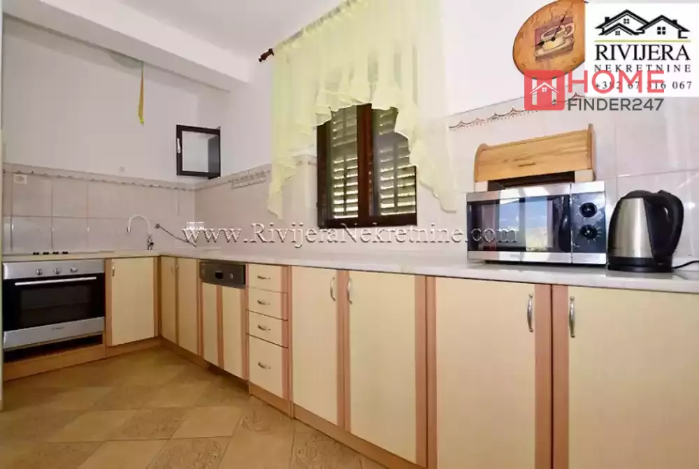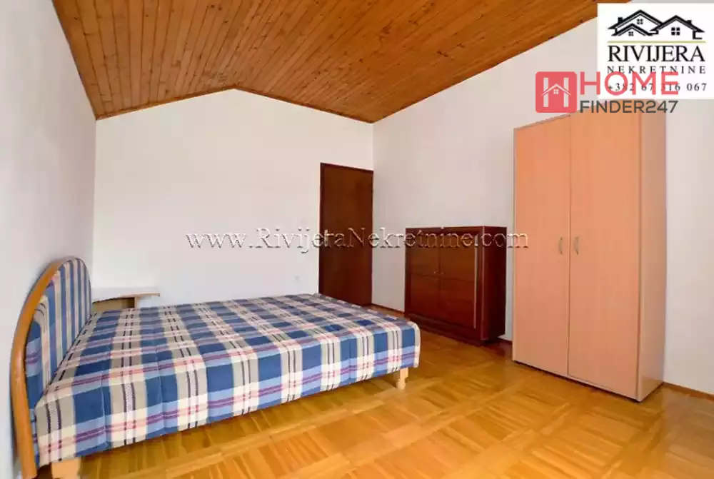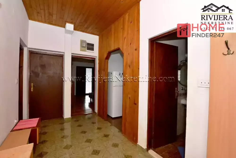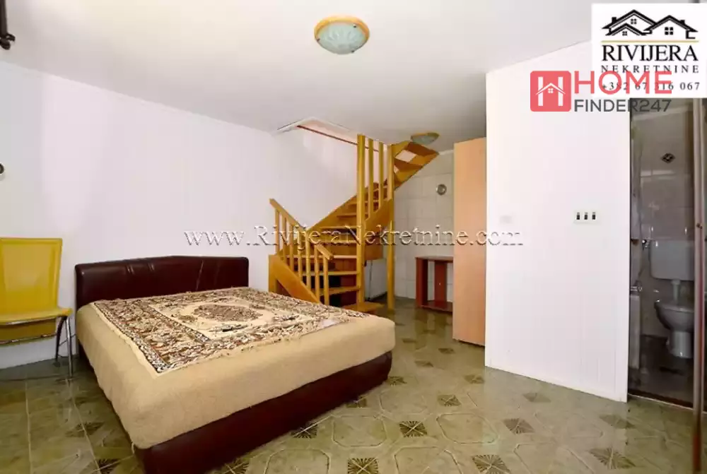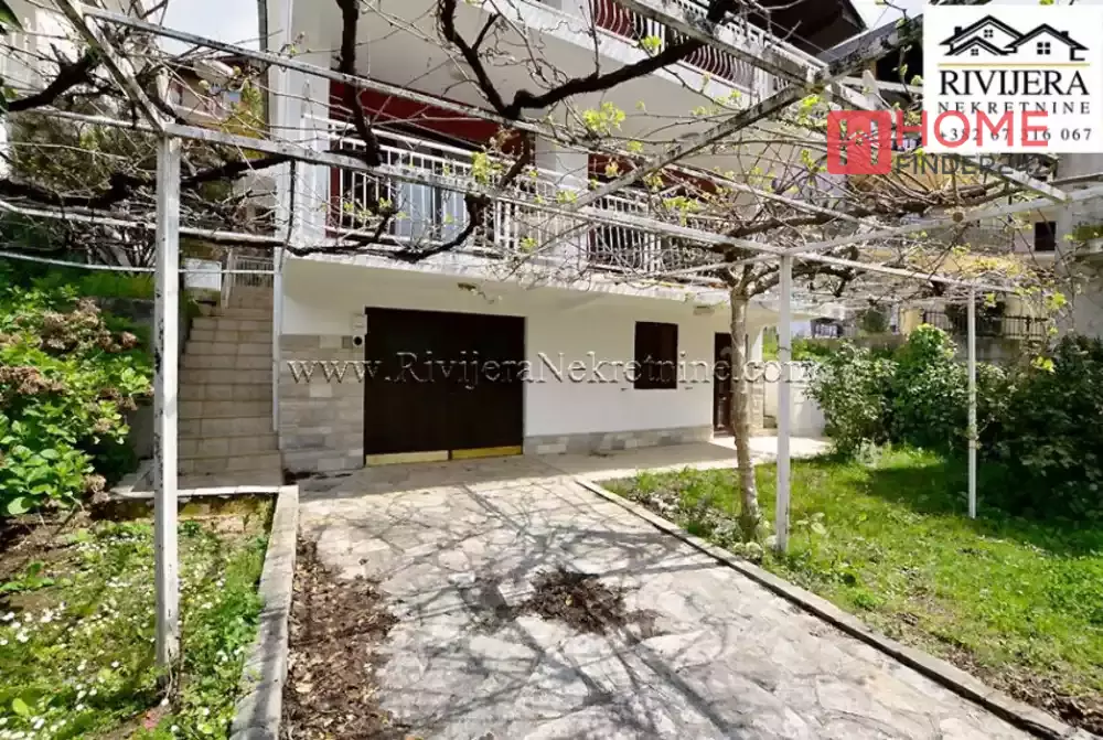 House with sea view in Topla Herceg Novi. House area 166 sqm, plot 374 sqm. Ground floor: garage and studio apartment of 14 sqm. First floor: apartment total area 68 sqm; layout: hallway, living room with kitchen, bedroom, bathroom and terrace. II floor: apartment total area 72 sqm; layout: hallway, kitchen, living room, two bedrooms, bathroom and terrace. Distance to the sea area 400 meters. Price 160.000 euros.
