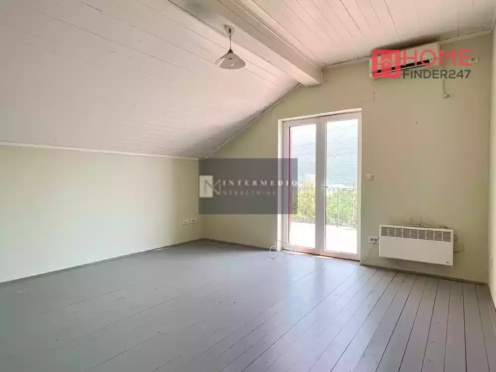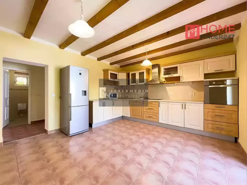 - First level: Entrance hall, large kitchen and dining room, living room with fireplace and access to the 25m2 terrace, bathroom