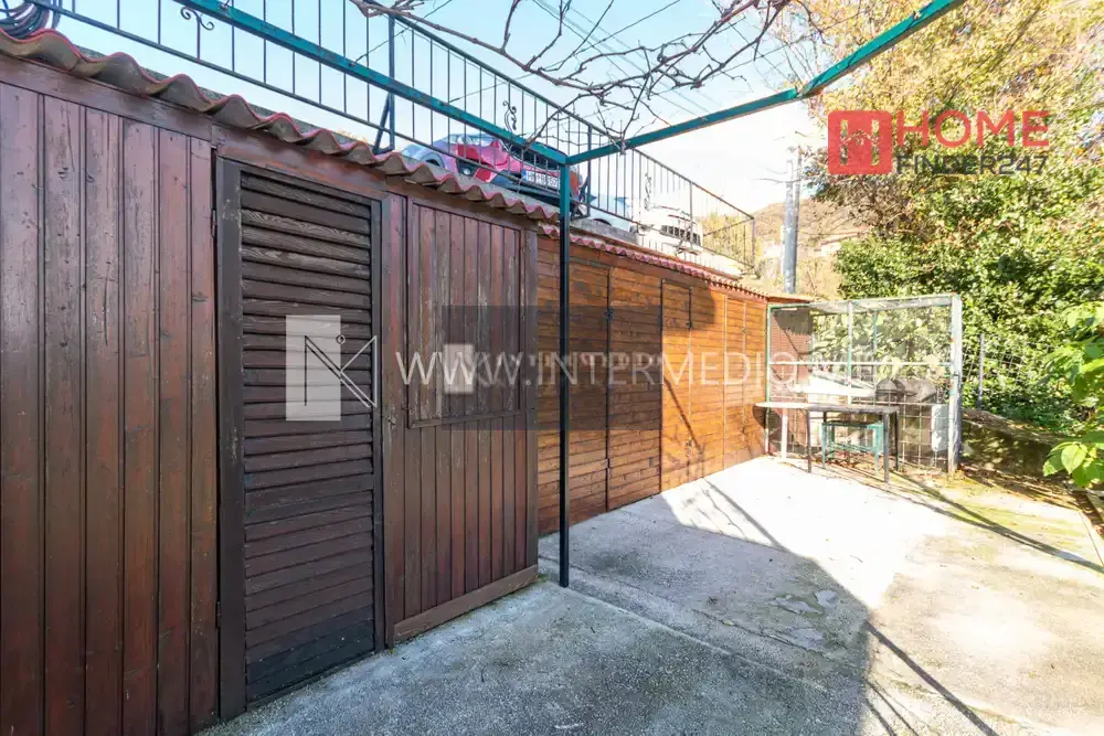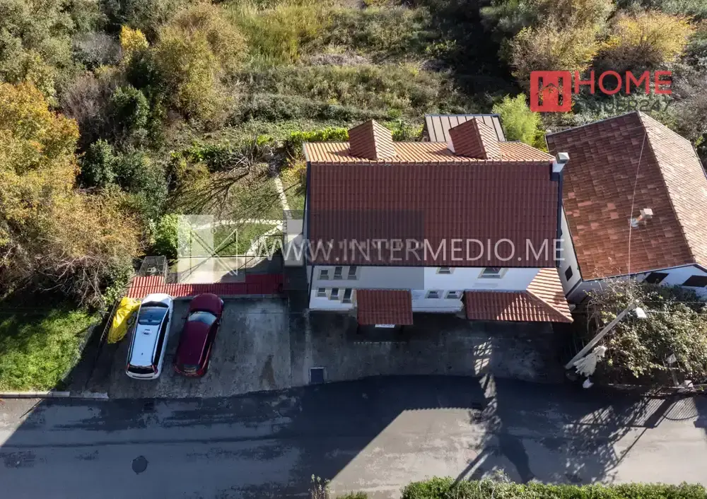In front of the house, there's parking for 5–6 cars. The yard is lush with various fruit trees, includes a drying room, extra storage, and a technical room with a pellet central heating system.