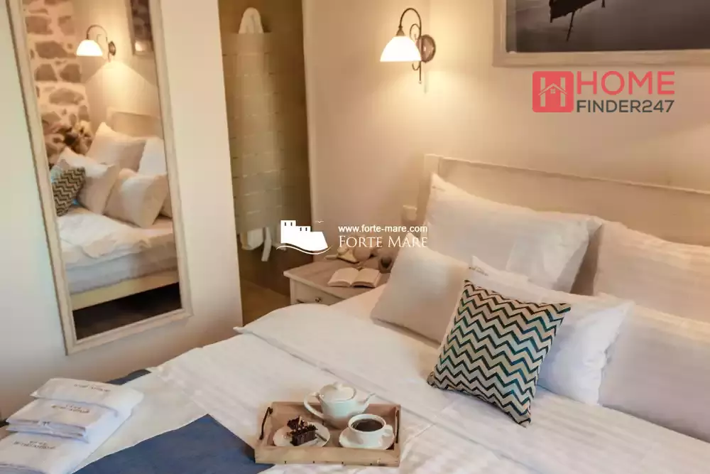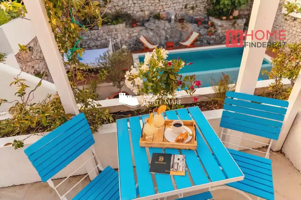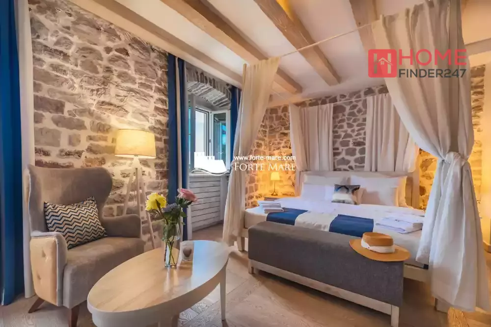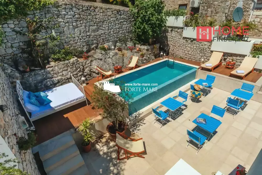 Hotel with sea view for sale in Kamenari, municipality of Herceg Novi. Hotel with a total area of 322m2, is located on a plot of 276m2. This 4-star hotel is a restorated captain's palace located in the Bay of Kotor, just 10 meters from the sea. Hotel located in a quiet little place, decorated in Mediterranean style with original stone walls and is a unique setting fo holiday. This is a small intimate hotel, capacity for a maximum of 15 people. Ground floor: reception, wine cellar, small restaurant, three rooms. Second floor: kitchen, three bedrooms, atrium with outdoor pool. Attic: room. The hotel has its own parking space.