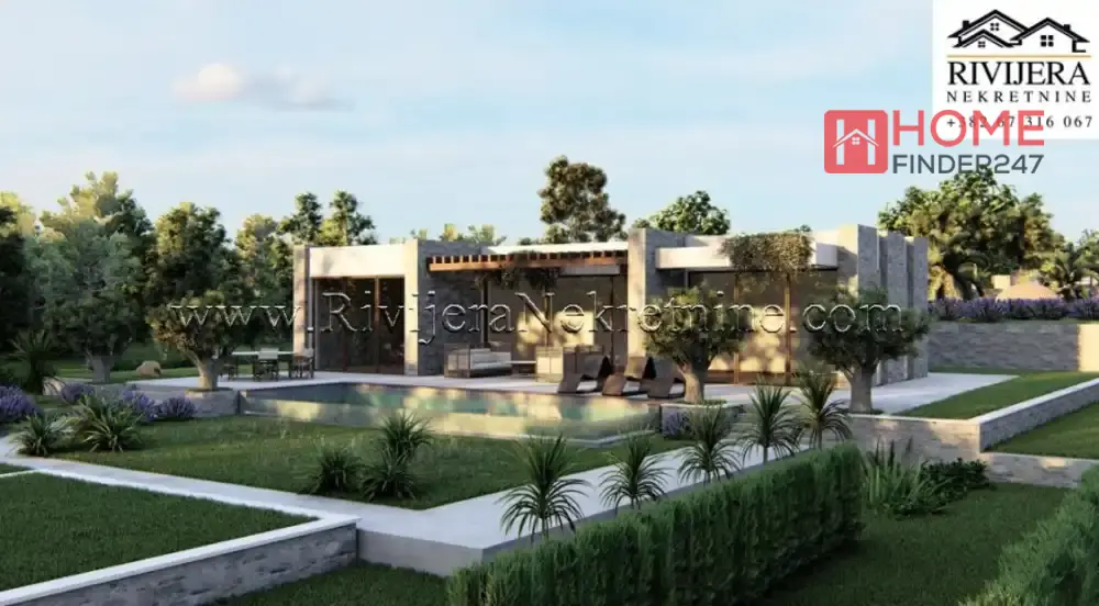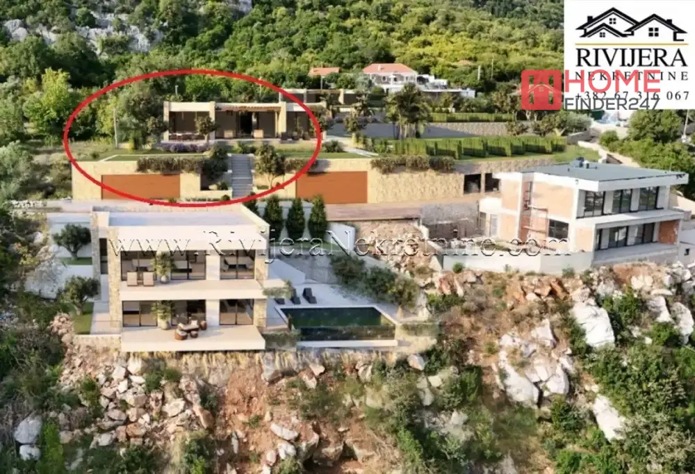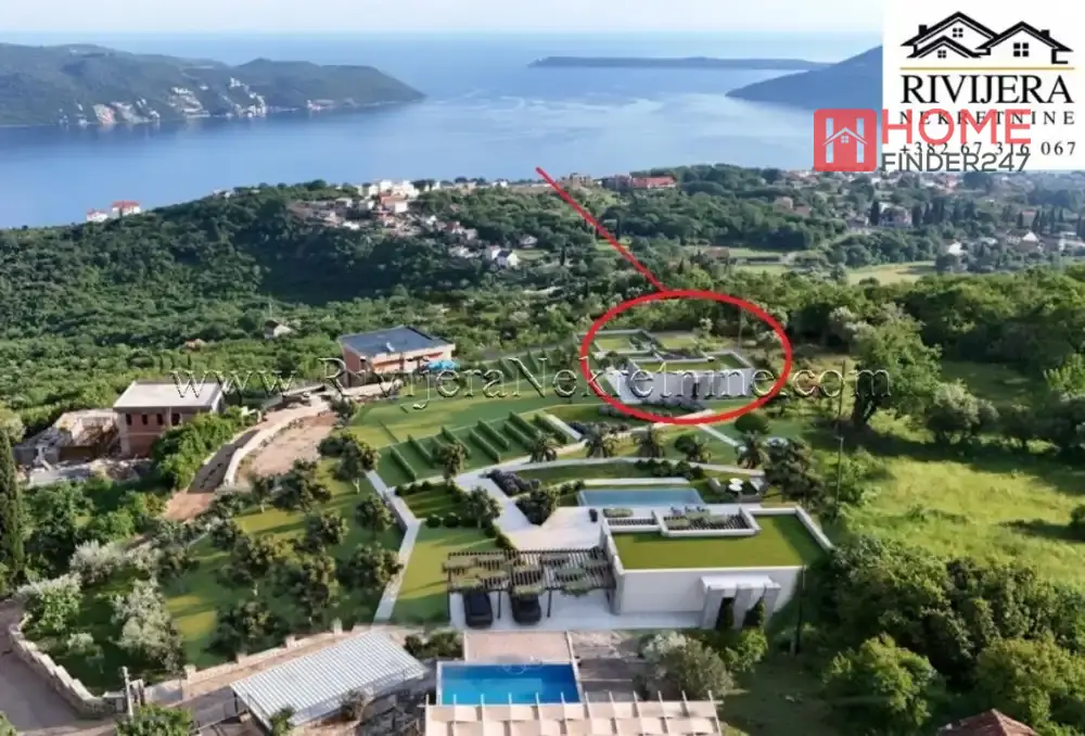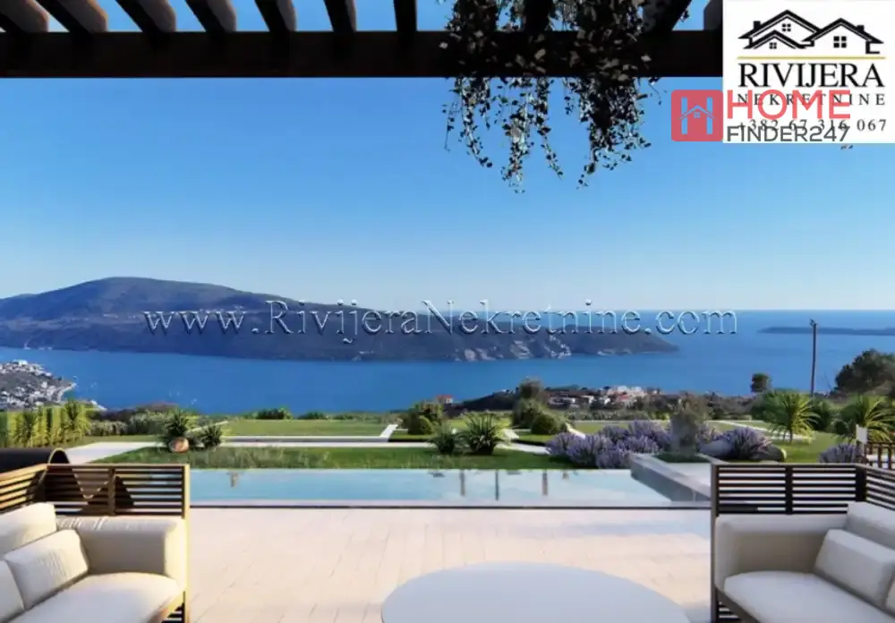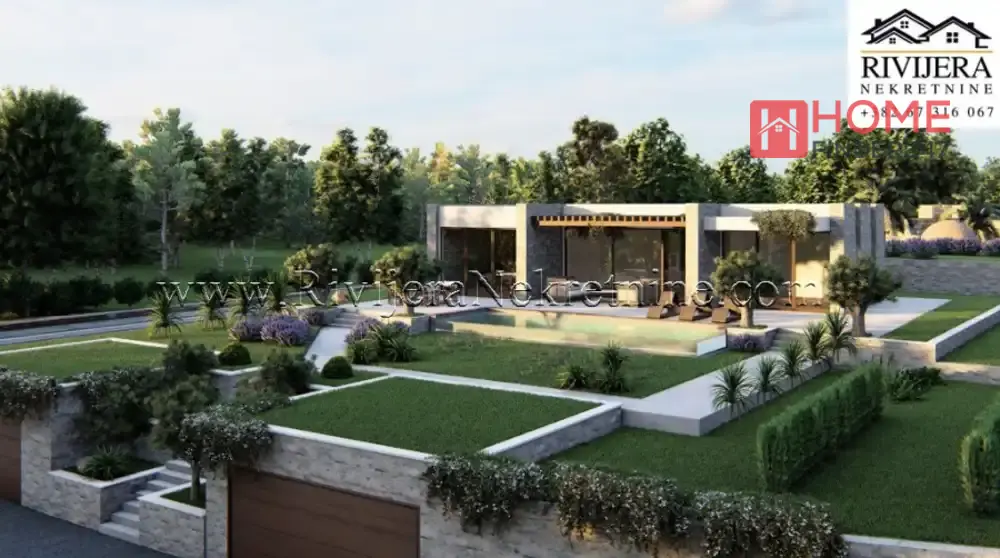 Luxury one-storey villa under construction for sale in Brajkovina, Podi. For sale is a luxury stone house in an authentic Mediterranean style, located in an exclusive private settlement with a limited number of villas. The villa has an area of ​​130 m2, on a plot of 800 m2. Room layout: living room with kitchen, three bedrooms, three bathrooms, terrace, and an "Infinity" swimming pool measuring 8x4m. The villa has a garage space and a reserve water tank. The villa is located at the end of the road, in complete silence and privacy. The "Infinity" swimming pool and spacious terraces offer a spectacular, permanent, and unique panoramic view of the sea and the entrance to Boka Kotorska. The villa is sold unfurnished. Professional maintenance of the house and pool is provided for future owners, making this property ideal as a private residence, weekend getaway, or exclusive investment for premium tourism. It is only 5 km from the sea, and a 10-minute drive from the prestigious marina "Lazure". Upon completion of the construction of all villas, the access road will be paved along the entire route from the beach to the houses, providing even easier and faster access. Price: €640,000