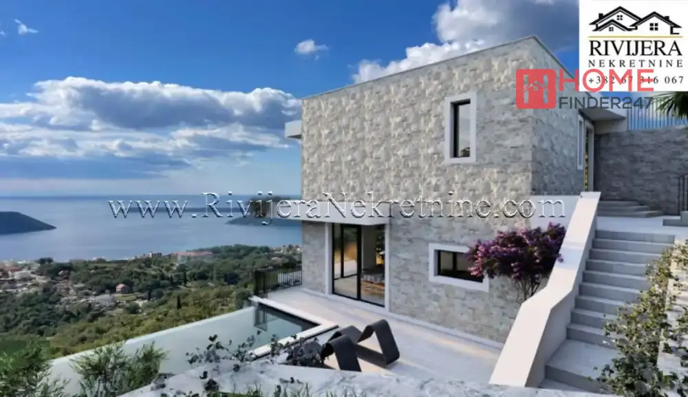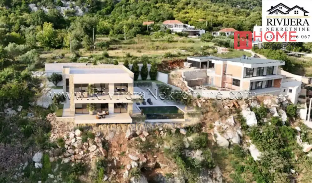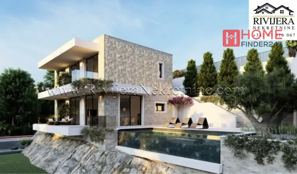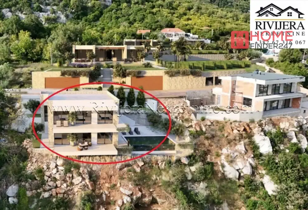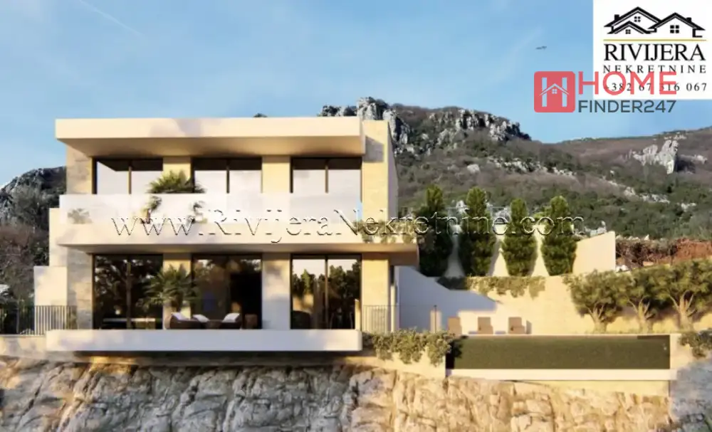 Two-storey luxury villa under construction Brajkovina Podi. Two-storey villa with an area of 190 m2, on a plot of 600 m2. Room layout: hallway, living room with kitchen and dining room, four bedrooms, three bathrooms, two terraces, laundry room, and storage room. The villa has a garage space and a reserve water tank. The villa is located at the end of the road, in complete silence and privacy. The "Infinity" pool and spacious terraces offer a spectacular, permanent, and unique panoramic view of the sea and the entrance to Boka Kotorska. Professional maintenance of the house and pool is provided for future owners, making this property ideal as a private residence, weekend getaway, or exclusive investment for premium tourism. The villa is being sold unfurnished. It is only 5 km from the sea, and a 10-minute drive from the prestigious Lazure marina. Upon completion of all villas, the access road will be paved along the entire route from the beach to the house, providing even easier and faster access. Completion date for the rough construction is June 2026, completion date for the complete building is June 2027. Price: €850,000 Price of the roughly finished villa: €450,000