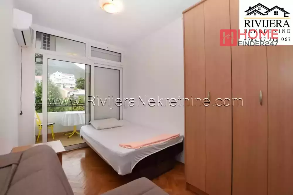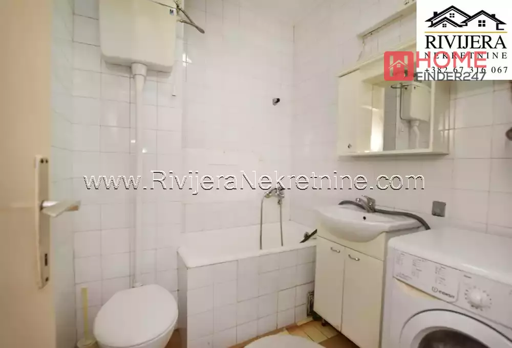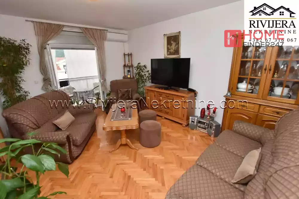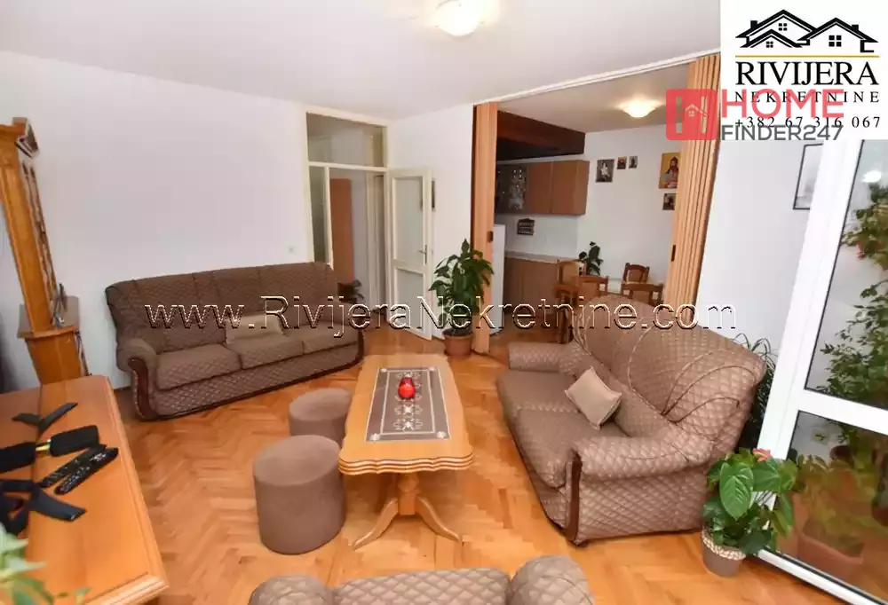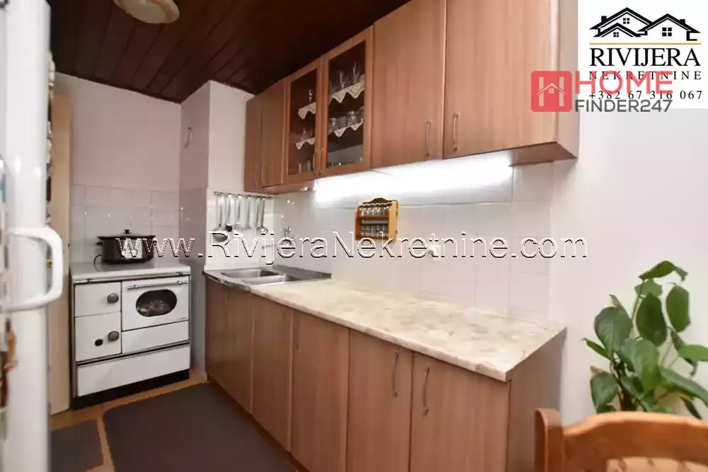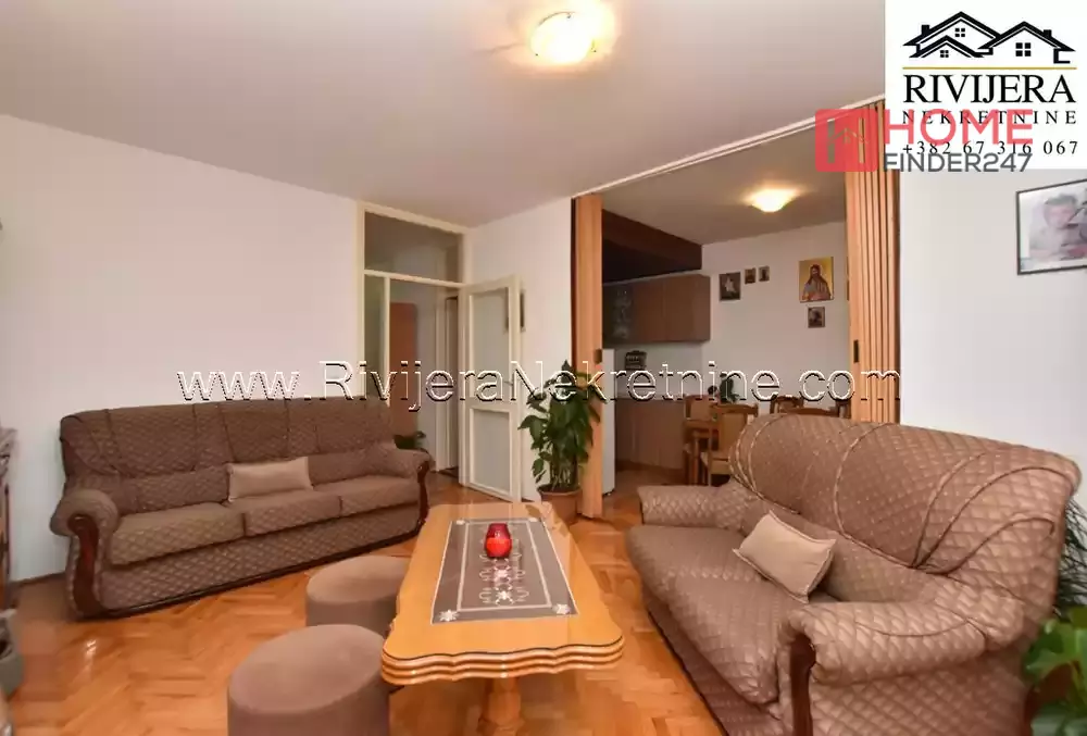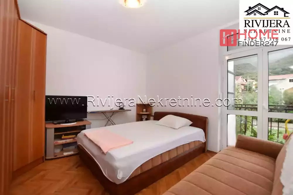 Djenovic dvosoban stan sa pogledom na more. Povrsina stana 72 m2, stambena zgrda, stara gradnja. Stan komforan, raspored prostorija: ulazni hodnik, dvije spavace sobe (sa dvijem male terase), kupatilo + toalet, kuhinja sa trpezarijom, dnevna soba, terasa ka moru. Stan ispod magistralnog puta, udaljen od mora 150 metara. Cijena: 210.000€