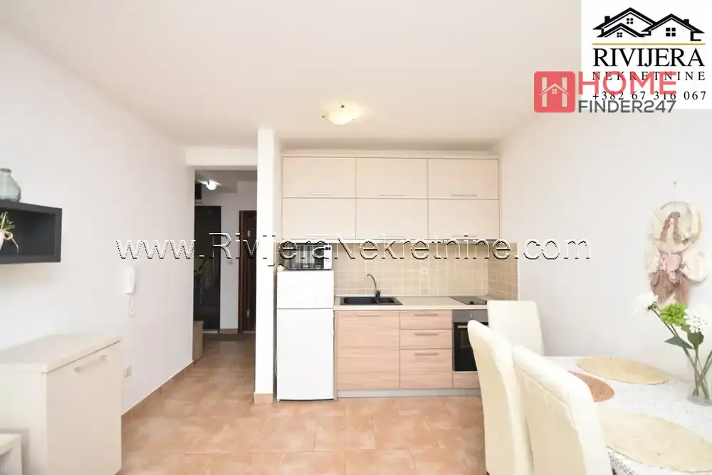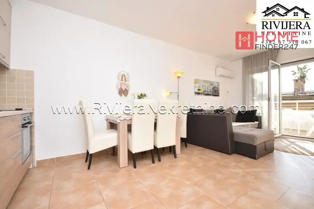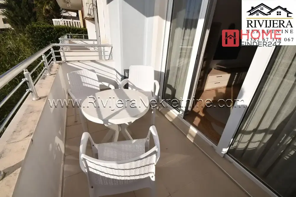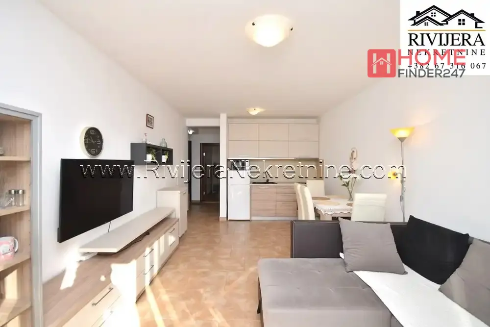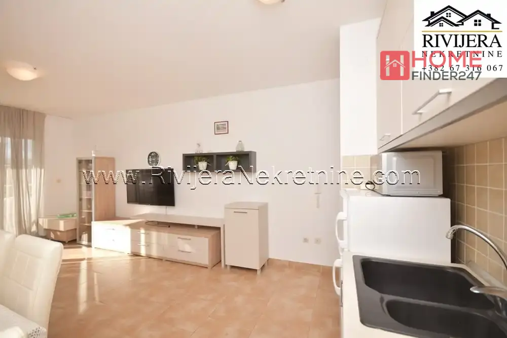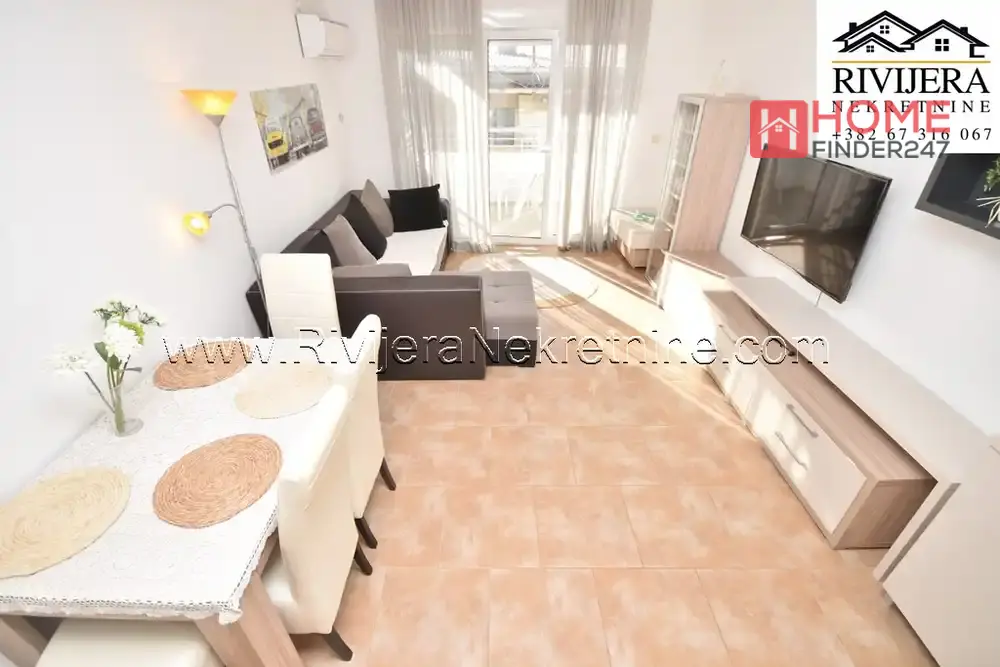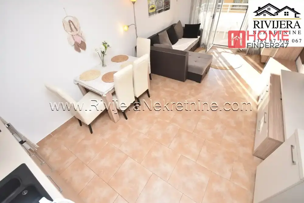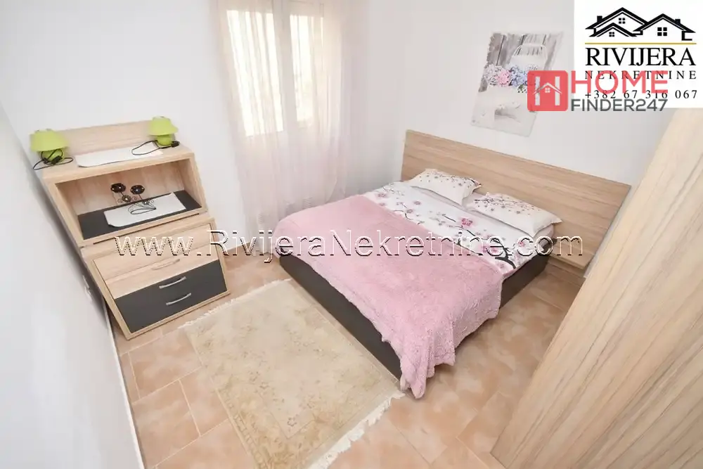 Jednosoban stan u blizini mora Savina. Povirsina stana 46m2, opremljen juzno orijentisan, svijetao. Stan u odlicnom stanju, raspored prostorija: ulazni hodnik, kupatilo, spavaca soba , dnevna soba sa kuhinjom, terasa ka moru. Atraktivna lokacija, tri minuta hoda do setalista 5 Danica.