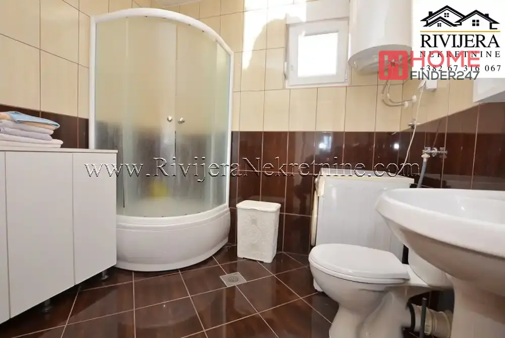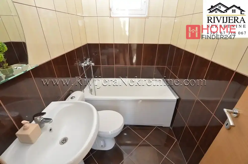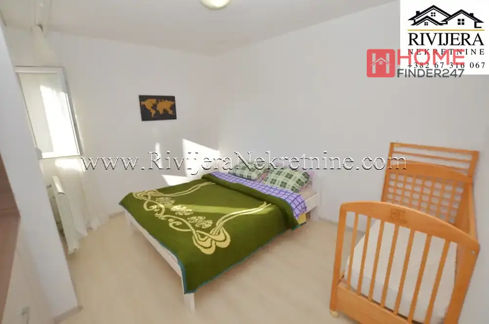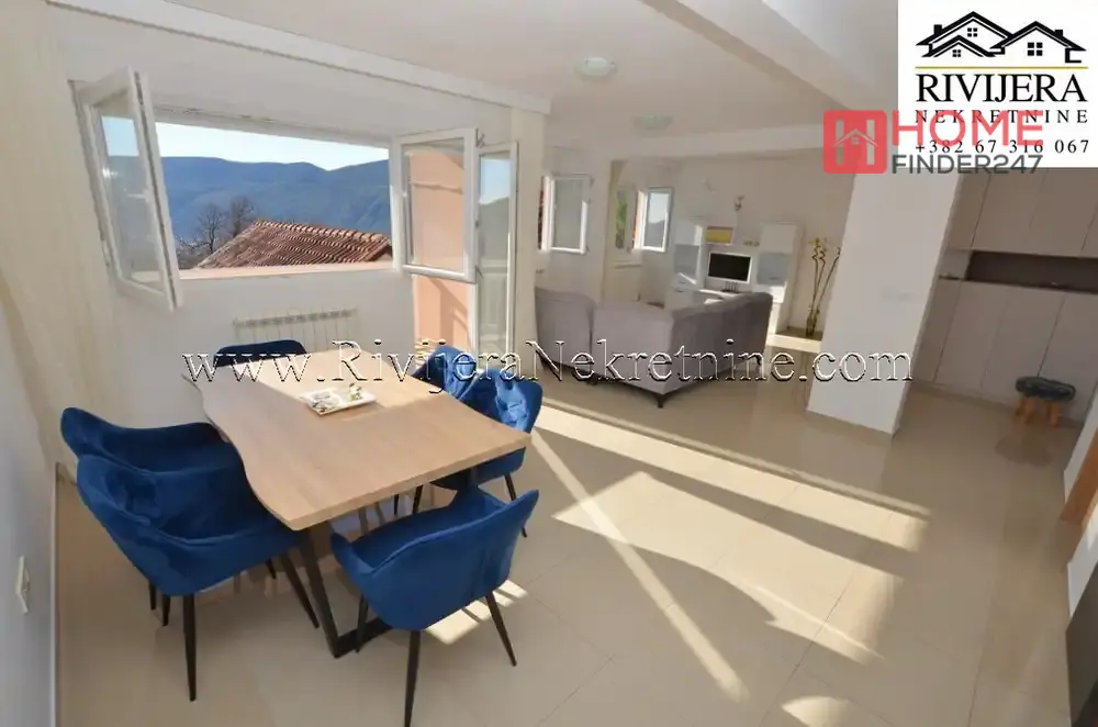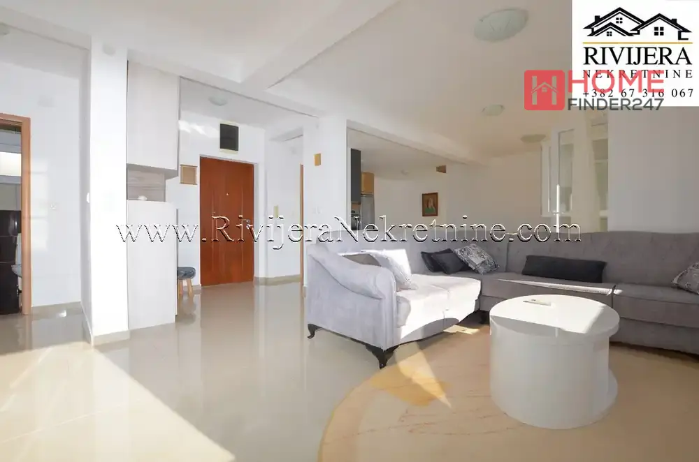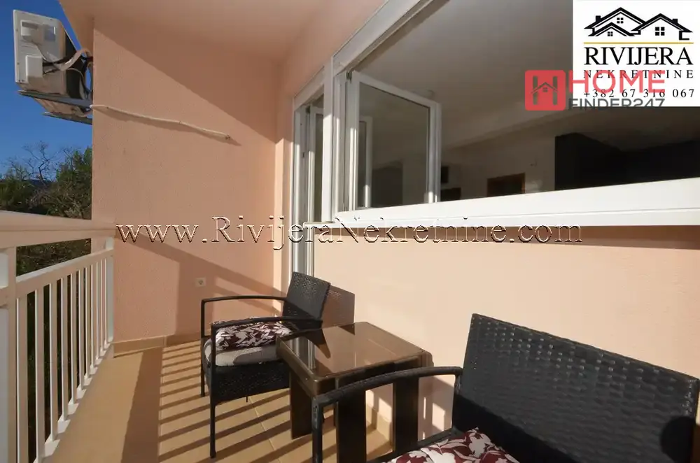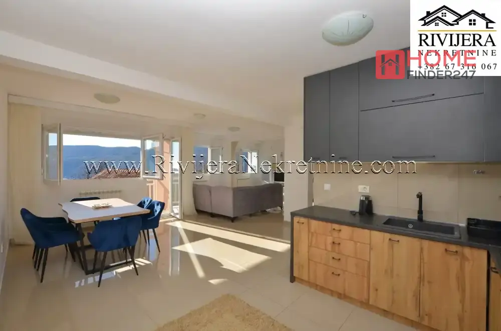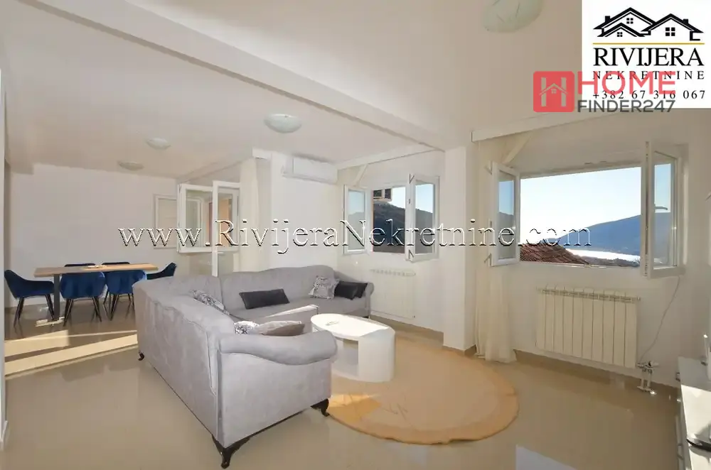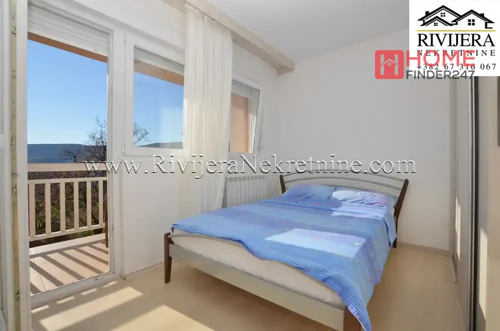 Dvosoban opremljen stan sa pogledom na more Herceg Novi Ratisevina. Povrsina stana 86 m2, raspored prostorija: dnevna soba sa kuhinjom, terasa (sa pogledom na more), dvije spavace sobe, dva kupatila. Parking obezbijedjen. Udaljenost od mora 4 km. Cijena: 150.000 eura