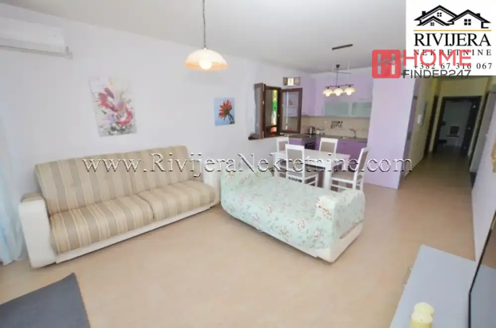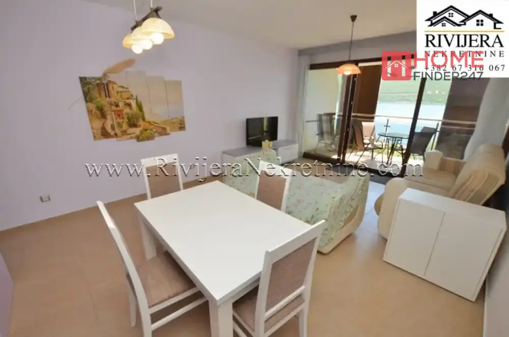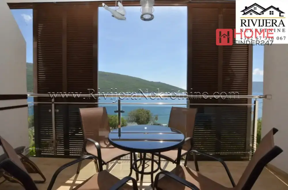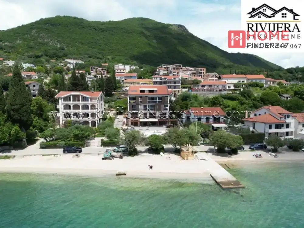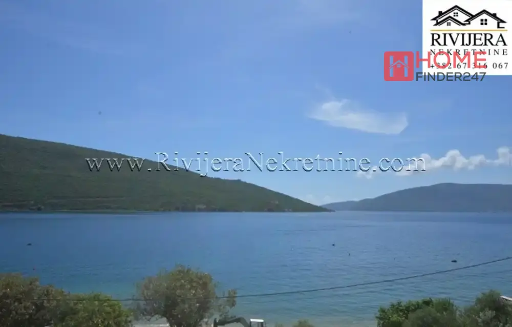 Prvi red do mora dvosoban stan Herceg Novi Kumbor. Povrsina stana 80 m2, raspored prostorija: ulazni hodnik, dva kupatila, dvije spravace sobe, dnevna soba, terasa sa pogledom na more. Novogradnja, drugi sprat, lift, stan opremljen u odlicnom stanju. Garazno parking mjesto. Cijena: 420.000 eura