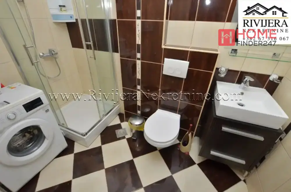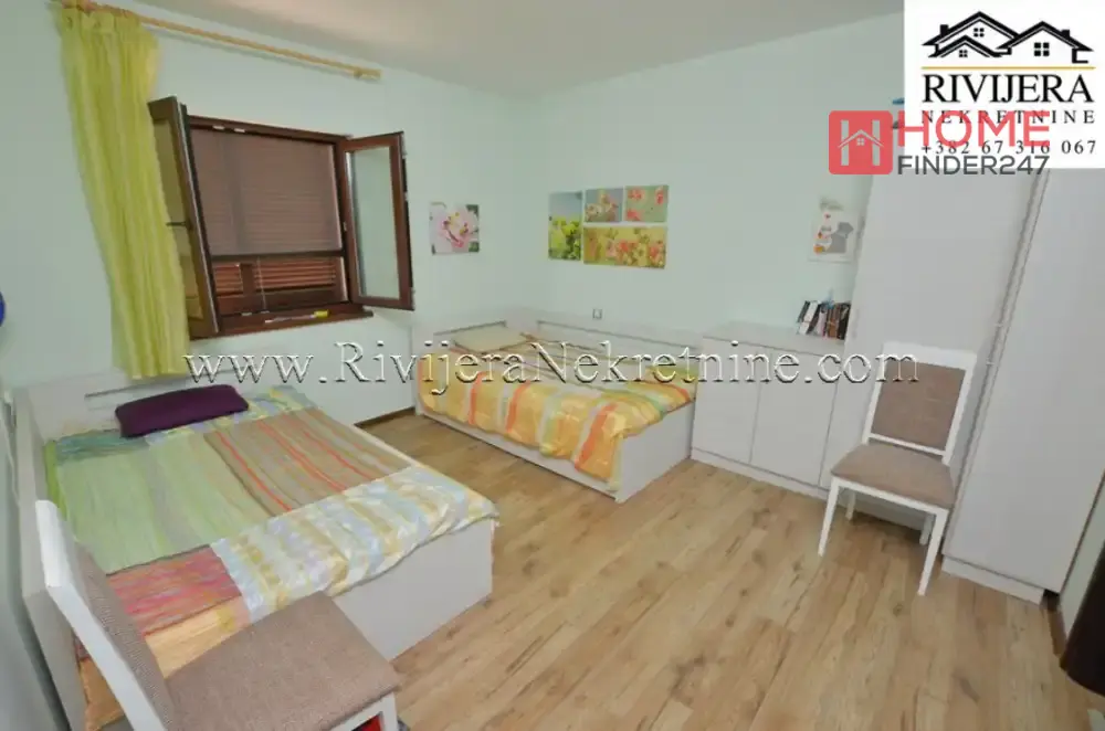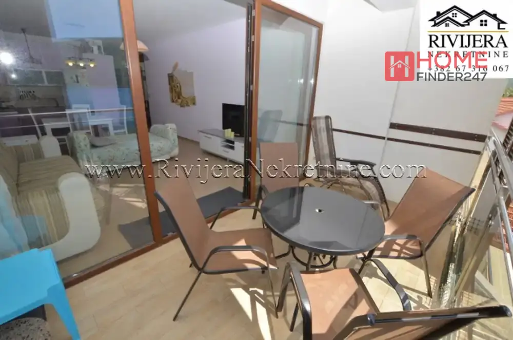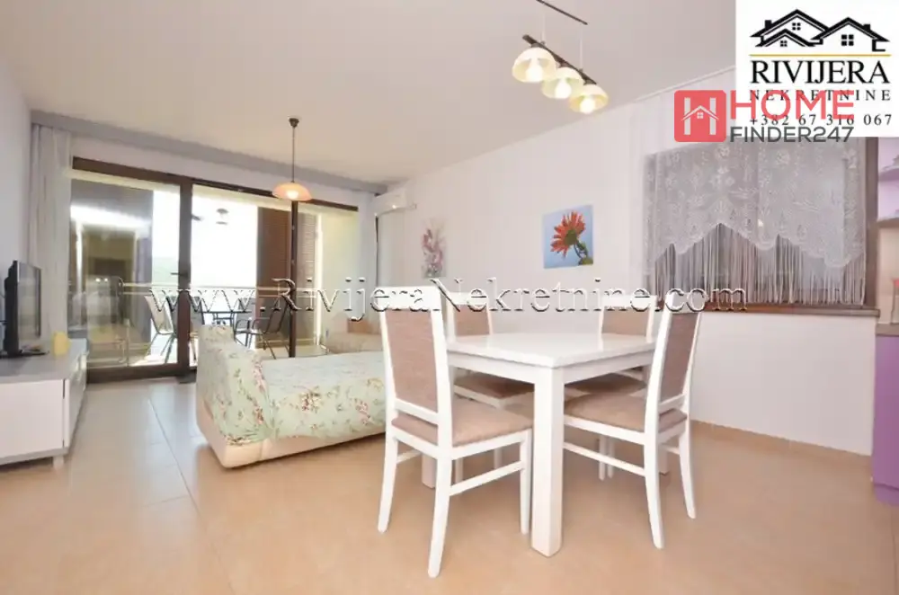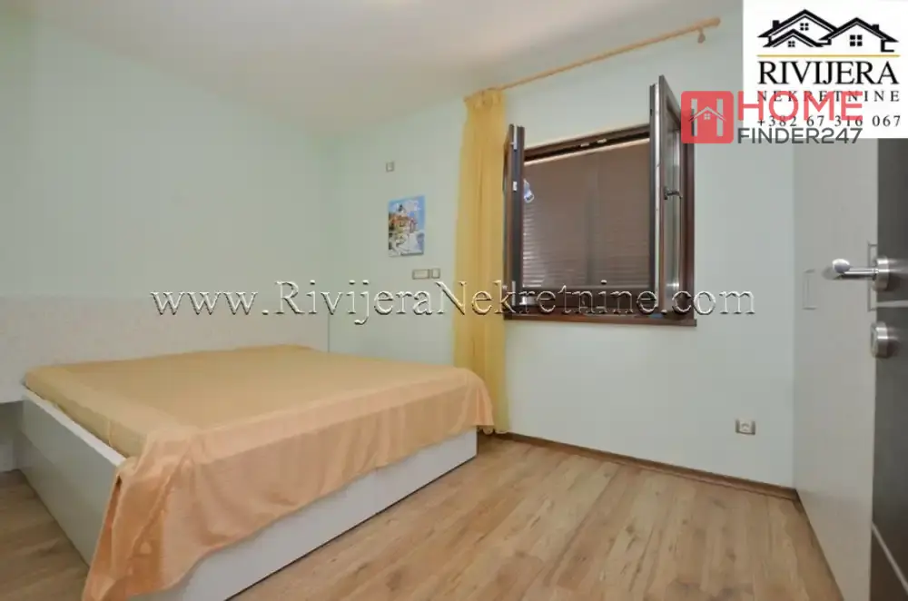 Prvi red do mora dvosoban stan Herceg Novi Kumbor. Povrsina stana 80 m2, raspored prostorija: ulazni hodnik, dva kupatila, dvije spravace sobe, dnevna soba, terasa sa pogledom na more. Novogradnja, drugi sprat, lift, stan opremljen u odlicnom stanju. Garazno parking mjesto. Cijena: 420.000 eura