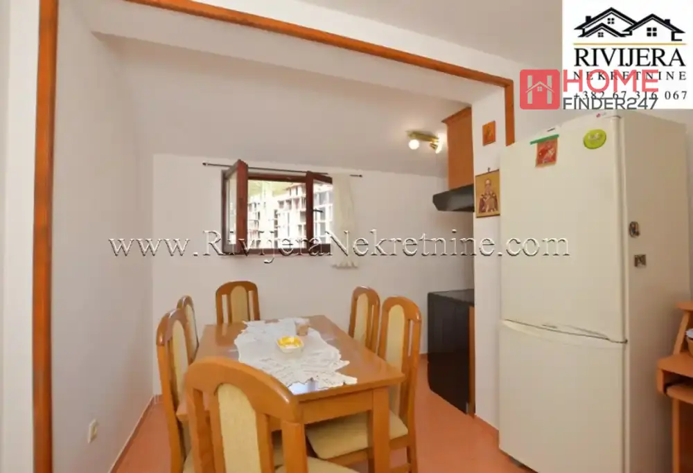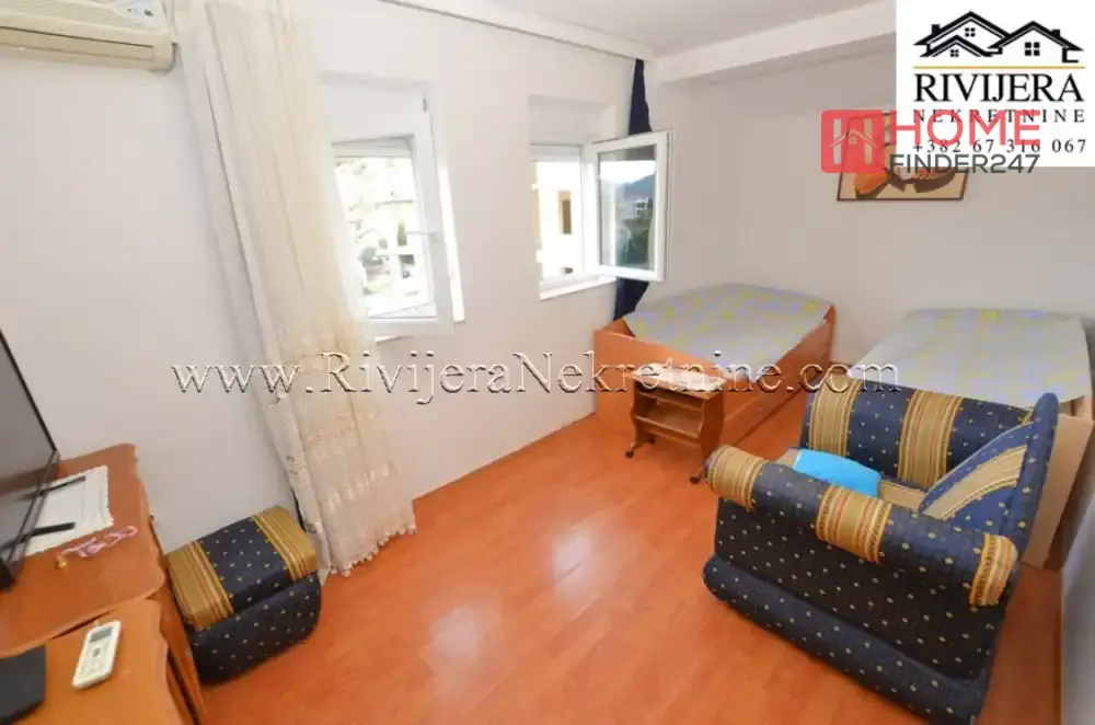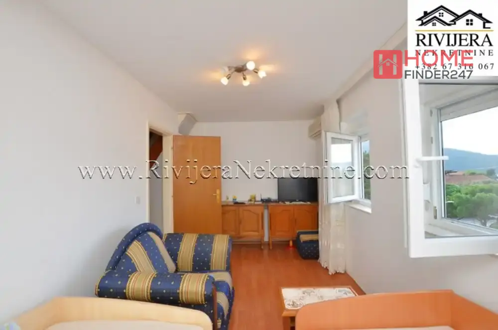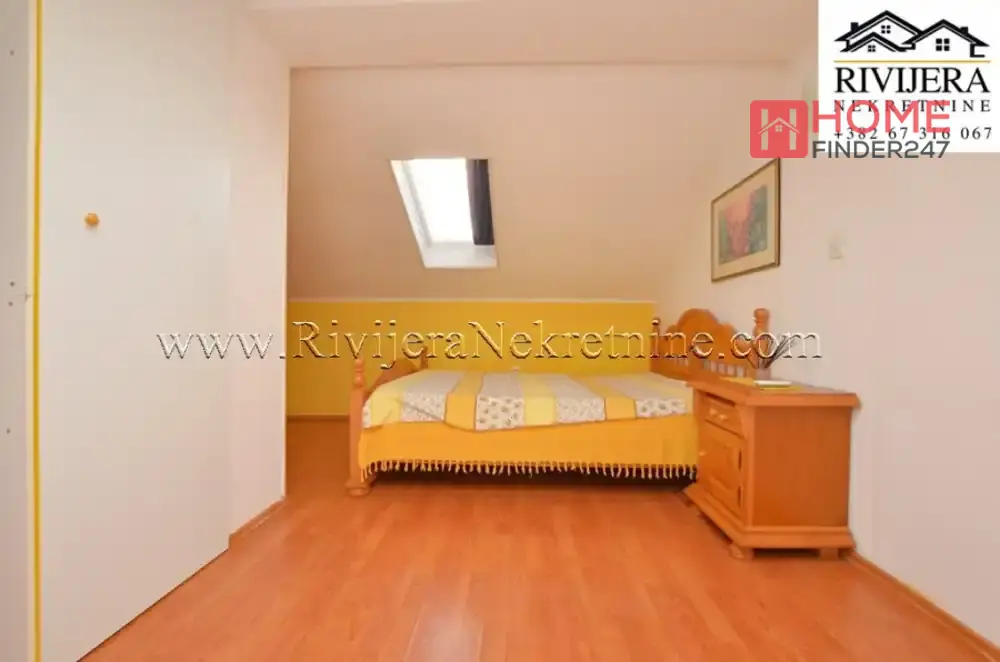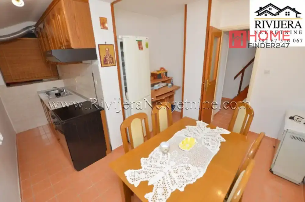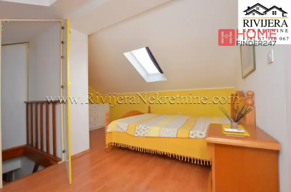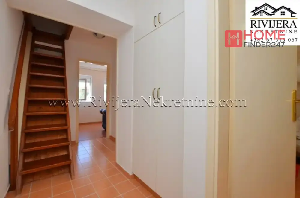 Kumbor stan na ekskluzivnoj lokaciji do Portonovog. Povrisna stana 65m2, (uknjizen na 43 m2), stan dupleks (na dva nivoa), Ulazni hodnik, kupatilo, kuhinja sa trpezarijom, dnevna soba, (gornja etaza) spavaca soba, terasa. Stan u dobrom stanju, uknjizen, mali bocni pogled na more. Odlicna lokacija za zivot i odmor. Cijena: 143.000 eura