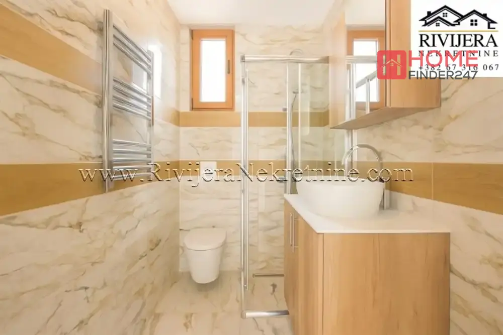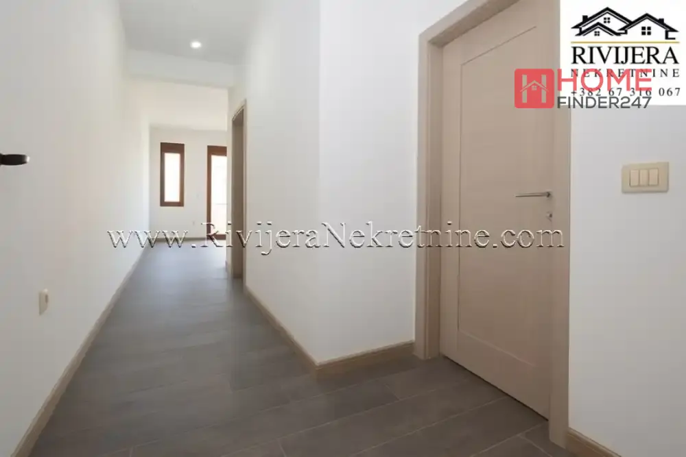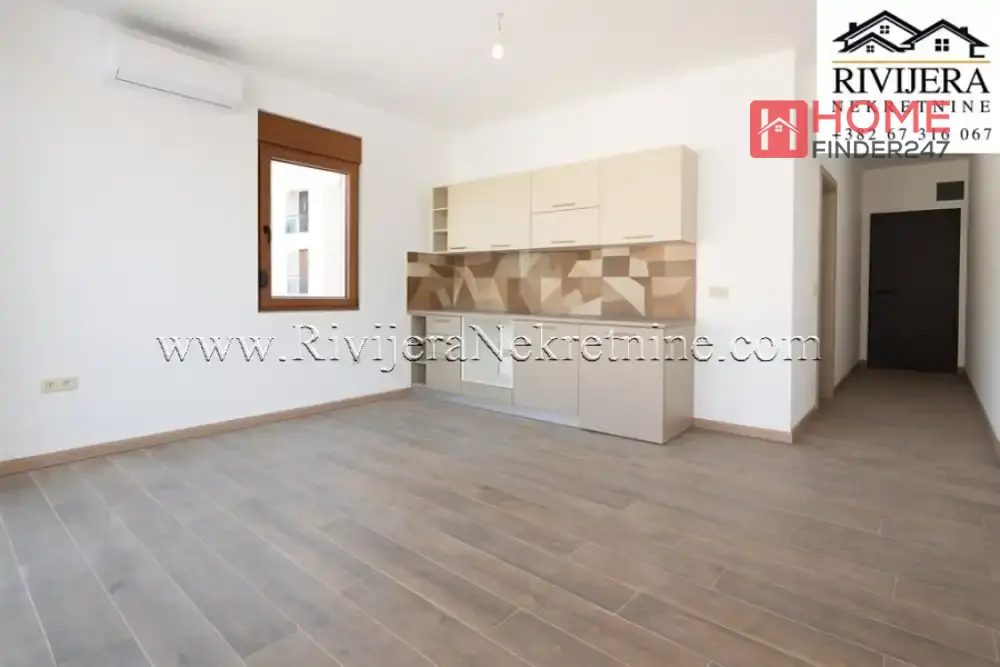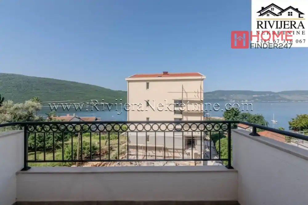 Raspored prostorija: hodnik, Dnevni boravak sa kuhinjom,spavaca soba, kupatilo, terasa sa prelijepim pogledom na more. Samo nekoliko minuta hoda od mirne kumborske obale i marine Portonovi, 250 m od mora. Lift u sklopu zgrade, obezbjedjeno parking mjesto. Aerodrom Tivat 20km. Cijena: 140,000€