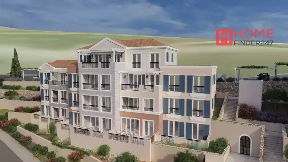 The apartment with a total internal area of 56 m2 will be situated on the first floor of a brand-new building. It consists of an open-plan living and dining area with a kitchen, a bedroom, a bathroom, and a terrace with a total area of 10 m2 with open views of the Adriatic Sea.
