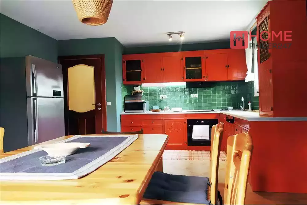 Huis te huur in Podgorica, Tološi. Deze gezinswoning van 180 m² beschikt over een ruime woonkamer met open haard, grote keuken en eethoek, die uitkomt op een terras van 25 m². Daarnaast zijn er drie slaapkamers, twee nette badkamers, een galerij en zakelijke ruimte.