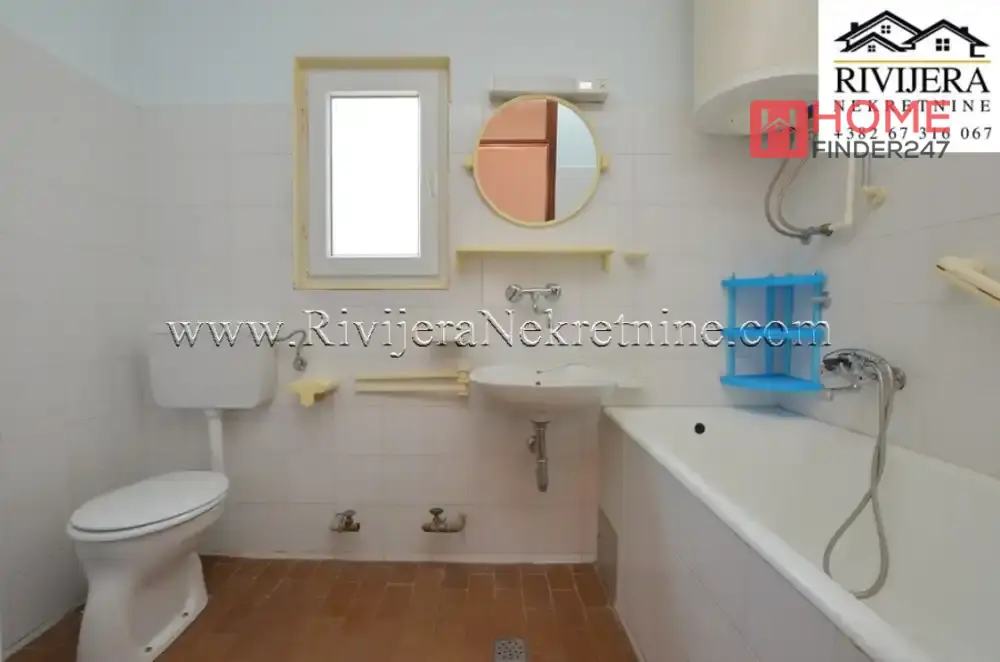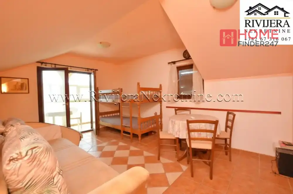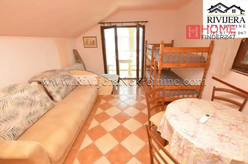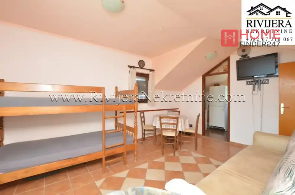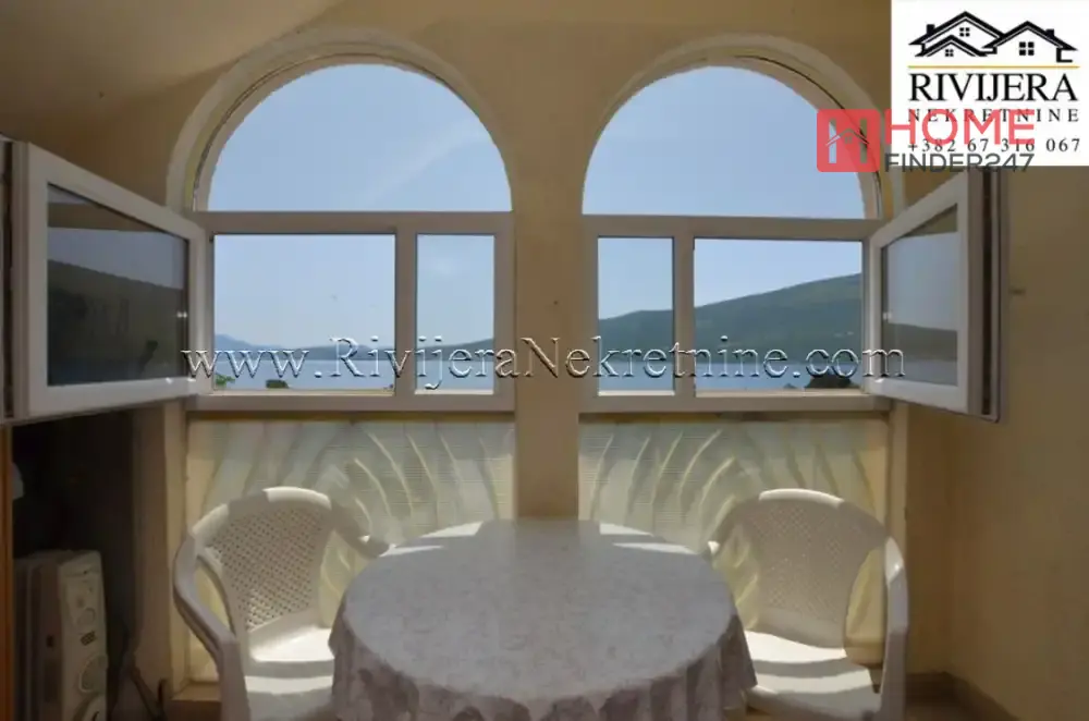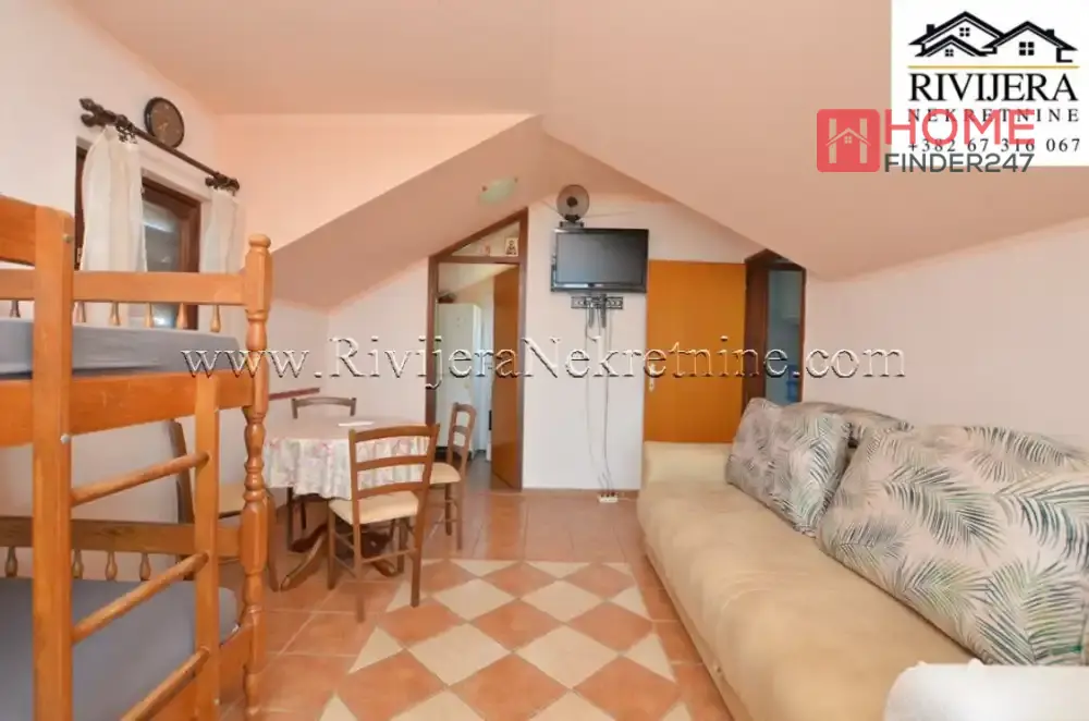 Apartament met uitzicht op zee in Baosic, Herceg Novi. Lichte woonkamer van 32 m², oude bouw. Indeling: entree, badkamer, woonruimte, keuken en terras (loggia). Op slechts 150 meter van het strand en de zee. Vraagprijs: 70.000€.