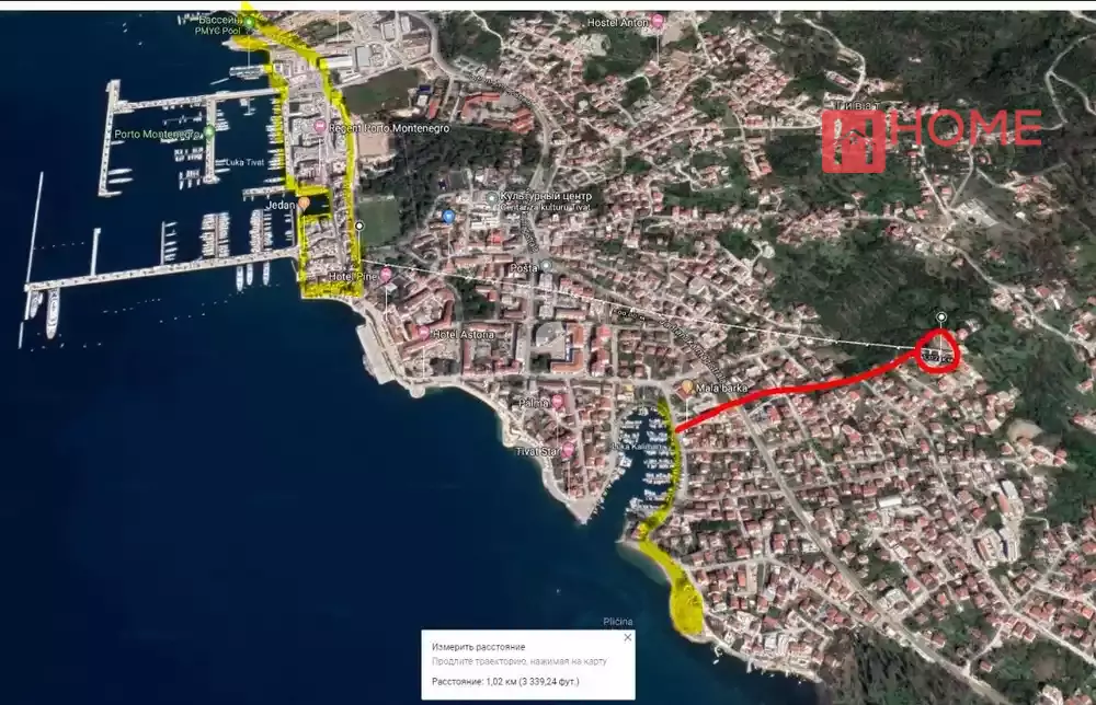 Per 8 minuta ne kembe mund te shkosh nga shtepia tek porti dhe qendra e Tivatit. Distanca nga deti – 500 m., nga Porto Montenegro – 1 km., dhe nga qendra e qytetit – 700 m. Shitje te rregullt te dyqaneve, restoranteve dhe vendeve per shëtitje.