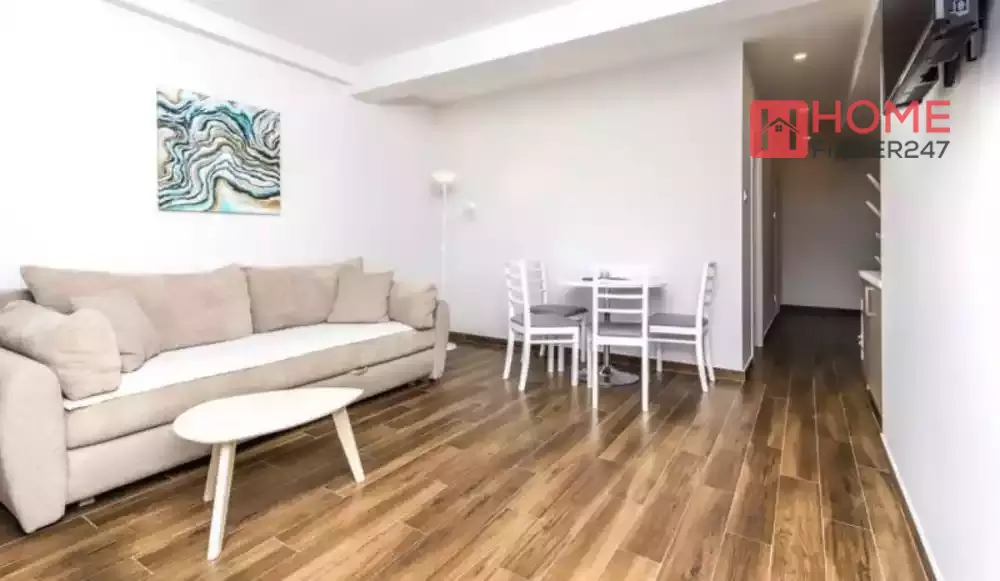 Bir odalı bu güzel daire, banyo, oturma odası, mutfak ve yemek alanı, antre ve muhteşem deniz manzaralı teras içeriyor.